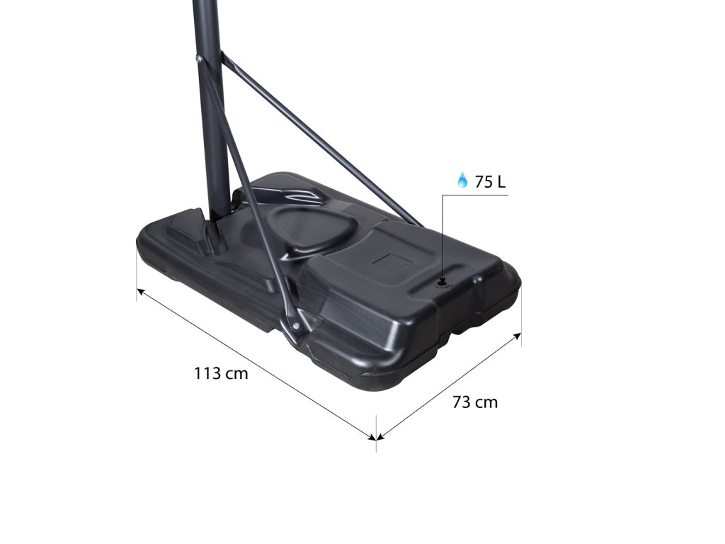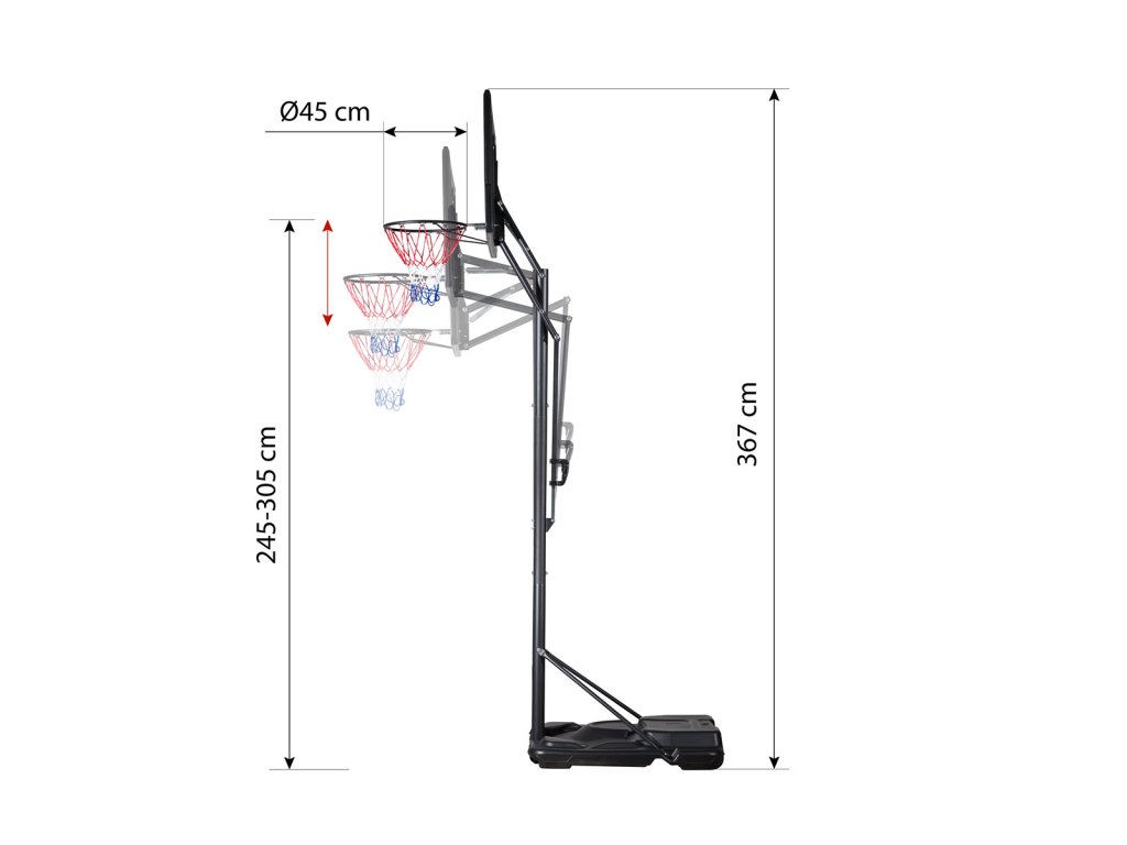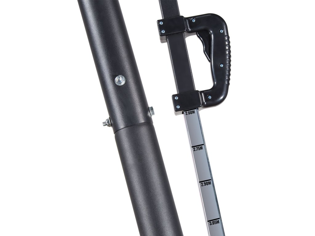Díky možnosti nastavení výšky se koš dokonale přizpůsobí vašim potřebám. Ať už jste začátečník, nebo zkušený šampion, náš koš vám poskytne dokonalé nastavení pro maximální využití vašeho potenciálu. Změna výšky se provádí uchopením madla, stisknutím tlačítka a posuvem madla po regulační tyči, která je cejchovaná, abyste okamžitě věděli, v jaké výšce se aktuálně nachází obruč. Výšku obruče lze nastavit do 5-ti úrovní v rozsahu od 2,45 do 3,05 metru.