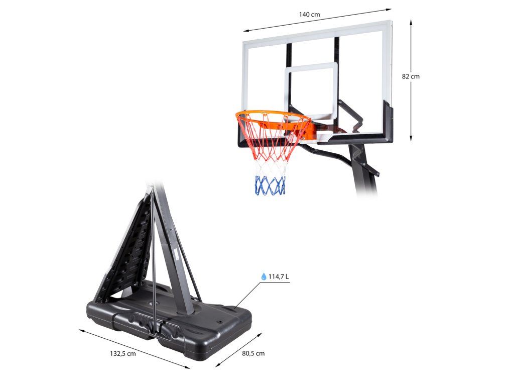 Koš ZDK027 byl vyroben z vysoce kvalitních a odolných materiálů, které zajišťují spolehlivost a dlouhou životnost i při náročném používání. Díky robustní konstrukci a odolnosti vůči povětrnostním vlivům je náš koš ideální pro vnitřní i venkovní použití. Deska o rozměrech 140 x 82 centimetrů je vyrobená z průhledného polykarbonátu a vydrží i ty nejtvrdší rány. Ocelová obruč o průměru 45 centimetrů je odpružená pomocí 2 silných pružin, toto řešení prodlužuje životnost koše a zajišťuje profesionální požitek ze hry. Do mohutné základny o rozměrech 133 x 81 centimetrů se vejde 115 litrů vody nebo písku pro maximální stabilitu koše. Pro dobrou mobilitu je základna osazena válečky pro snadné přesouvání. Nad základnou se nachází odrazová deska pro trénink přihrávek.
