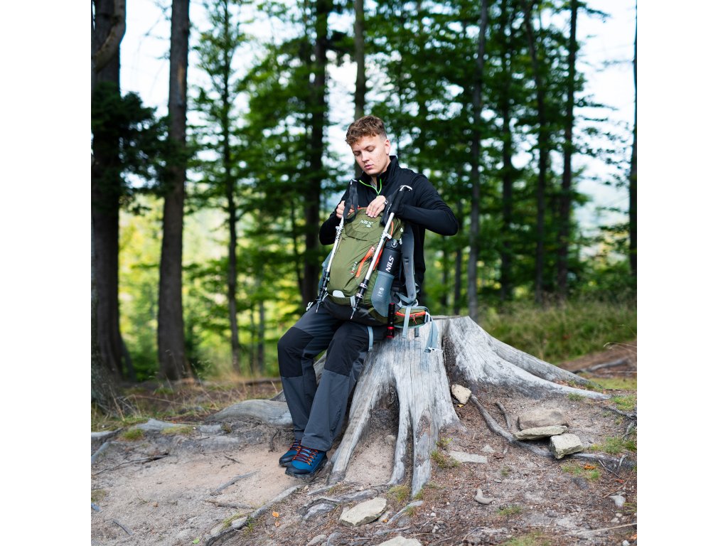 Hlavní komora na dvoucestný zip je opatřena kapsou na hydrovak, který lze zavěsit na řemínek se suchým zipem. Druhá, menší komora je také opatřena dvoucestným zipem a uvnitř se nachází 2 síťované kapsy na drobnosti. Čelní panel tvoří rozměrnou kapsu, do které se přistupuje 15 cm dlouhým, jednocestným zipem z pravé strany. Po stranách batohu jsou síťované kapsy s gumičkou v lemu, nad kapsami se nachází délkově nastavitelné popruhy s přezkou, pod které lze umístit například vyšší láhev. Na bederním pásu jsou 2 kapsy na zip, do kterých se vejdou například klíče, nebo multitool. Z čela batohu se nachází 2 gumová poutka a 2 smyčky pro přenášení turistických holí.
