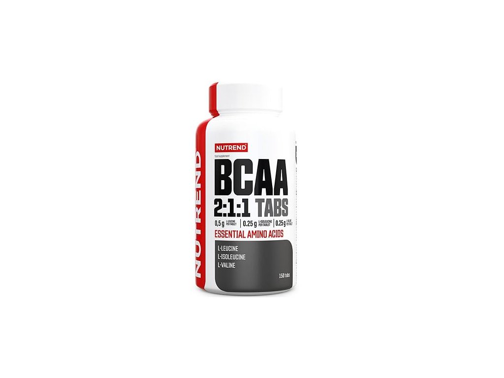 Esenciální větvené aminokyseliny v poměru 2:1:1, ve formě tablet. Dostatečný příjem kvalitních bílkovin s optimálním aminokyselinovým spektrem přispívá ke svalovému růstu. poměr BCAA 2:1:1 1 000 mg BCAA v jedné tabletě praktické dávkování ve formě tablet BCAA 2:1:1 je určen: pro intenzivně trénující sportovce Složení: L-leucin, L-isoleucin, L-valin, plnidlo mikrokrystalická celulóza, protispékavá látka stearan hořečnatý, plnidlo zesíťovaná celulózová guma, zahušťovadlo hydroxypropylmetylcelulóza Doporučené dávkování produktu BCAA: 3 tablety 60 minut před zátěží, 3 tablety ihned po zátěži. Nepřekračujte doporučené dávkování. Použití: dle doporučeného dávkování polkněte tablety a zapijte dostatečným množstvím vody. Nejsou vhodné alkoholické a mléčné nápoje. Tablety nekousejte! Po otevření skladujte při teplotě do 25 °C a spotřebujte do 3 měsíců. Složení: L-leucin, L-isoleucin, L-valin, plnidlo mikrokrystalická celulóza, protispékavé látky stearan hořečnatý a oxid křemičitý. Upozornění: Doplněk stravy, vhodný zejména pro sportovce. Nenahrazuje pestrou stravu. Není určeno pro děti, těhotné a kojící ženy. Ukládejte mimo dosah dětí! Skladujte v suchu při teplotě do 25 °C mimo dosah přímého slunečního záření. Chraňte před mrazem. Výrobce neručí za případné škody vzniklé nevhodným použitím nebo skladováním. Dodavatel: NUTREND D.S., a.s., Chválkovice 604, 779 00 Olomouc, Česká republikaDoplňkové parametry