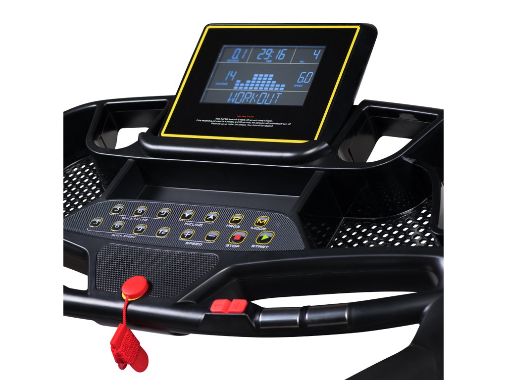 Klávesnice je vybavena tlačítky Start, Stop, Program, Mode. Dále se zde nachází ltačítka pro plynulou změnu rychlosti a skokovou změnu rychlosti na 3, 6, 9, nebo 12 km/h a o řadu výše se nachází tlačítka pro plynulou změnu úhlu běžecké plochy a tlačítka pro skokovou změnu úhlu na 3, 6, nebo 9°.