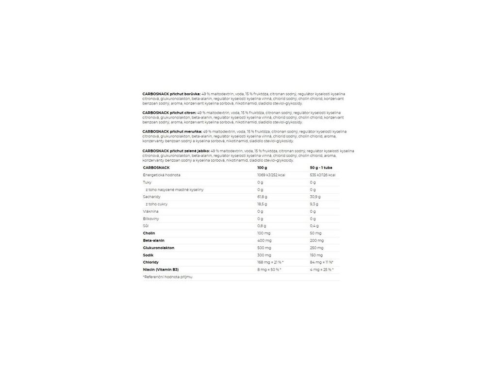 Rychlá energie ve formě gelu obsahuje kombinaci dvou typů sacharidů ve vyváženém poměru, spolu s dalšími účinnými látkami je ideální pro rychlé doplnění energie a řešení energetické krize v průběhu fyzické zátěže s vysokou tepovou frekvencí. 31 g sacharidů 2 typy sacharidů 200 mg beta-alaninu 50 mg cholinu 250 mg glukuronolaktonu 150 mg sodíku 4 mg vitamínu B3 bez lepku bez umělých barviv praktická forma tub nebo sáčků nutriční hodnoty viz obrázky CARBOSNACK doporučené dávkování: v případě potřeby použijte během aktivity. Maximálně 4 tuby za den. Nepřekračujte doporučené dávkování. Upozornění: Doplněk stravy, s cukrem a sladidlem. Nenahrazuje pestrou stravu. Není určeno pro děti, těhotné a kojící ženy. Ukládejte mimo dosah dětí! Chraňte před teplem, mrazem a vlhkostí. Odšroubujte uzávěr a odstraňte plombu. Po otevření obsah tuby ihned spotřebujte. Dodavatel: NUTREND D.S., a.s., Chválkovice 604, 779 00 Olomouc, Česká republikaDoplňkové parametry