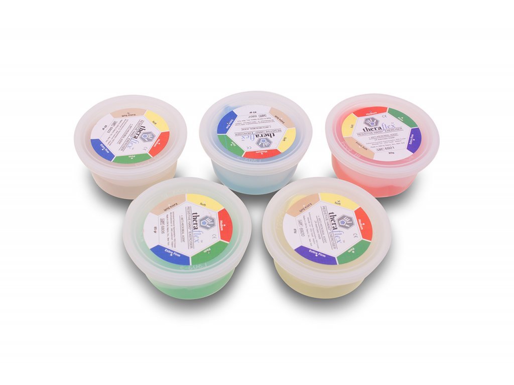 Theraflex Putty™ Übungs-, Rehabilitations- und Kräftigungsmasse  stärkt den durch Training geschwächten Griff und wird für Rehabilitationsübungen oder Stressabbau verwendet. Ein ausgezeichneter Helfer zur Entspannung und Rehabilitierung müder Finger bei längerer Arbeit an der Tastatur. Theraflex Putty ist geruchlos, hinterlässt keine Flecken und hinterlässt keine Rückstände auf den Händen, ist ungiftig, nicht fettend, hypoallergen und umweltfreundlich latexfrei. Das Material ist mit einer antimikrobiellen Komponente angereichert. Pflege: Mit lauwarmem Seifenwasser waschen.
