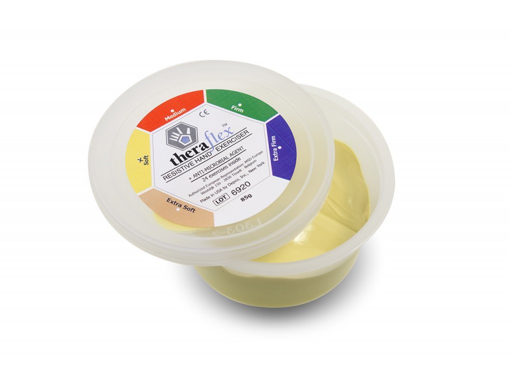 Theraflex Putty™ Übungs-, Rehabilitations- und Kräftigungsmasse™ stärkt den durch Training geschwächten Griff und wird für Rehabilitationsübungen oder Stressabbau verwendet. Ein hervorragender Helfer zur Entspannung und Rehabilitierung müder Finger bei längerer Arbeit an der Tastatur. Theraflex Putty ist geruchlos, hinterlässt keine Flecken und hinterlässt keine Rückstände auf den Händen, ist ungiftig, nicht fettend, hypoallergen und umweltfreundlich latexfrei. Das Material ist mit einer antimikrobiellen Komponente angereichert. Pflege: Mit lauwarmem Seifenwasser waschen.