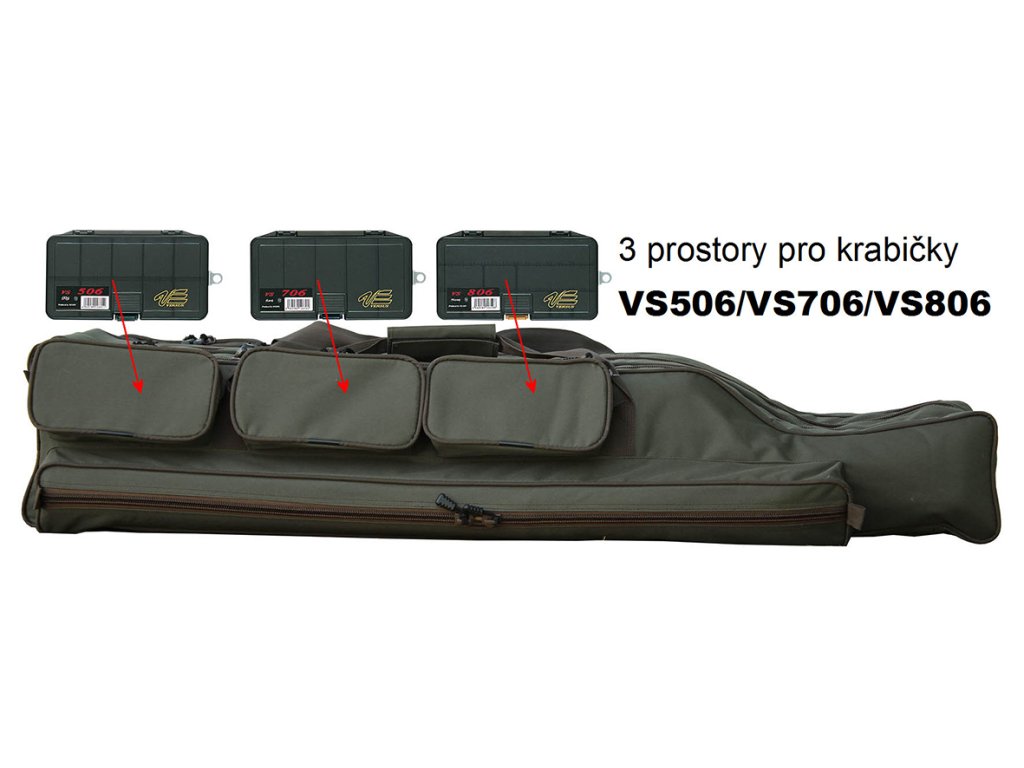 Die Rutentasche mit drei Fächern bietet Platz für fast alles, was Sie für Ihren Angelausflug benötigen. Die Breite der Kammer beträgt 11 cm, die Höhe 21 cm verjüngt sich auf 11 cm bei 80 cm. Dadurch entsteht genügend Platz für die an der Rute montierte Rolle. Auf einer Seite befindet sich eine lange Tasche mit den Maßen 89 x 9 x 5 cm für ein Tablett und darüber drei Taschen mit den Maßen 20 x 10 x 5 cm für Kleinteile oder für Versus-Boxen vom Typ VS506, VS706 und VS806. Auf der anderen Seite befinden sich drei Taschen mit den Maßen 20x20x5cm, in die Boxen vom Typ VS3010NDM, VS3010ND und VS3010NS passen. Durchgehend kommen große feste Reißverschlüsse mit zwei Schiebern zum Einsatz, die statt eines Metallgriffs über eine Schnur mit Kunststoffgriff verfügen. Der Bezug besteht aus starkem Nylon-Oxford-Material, das sehr robust und langlebig ist.Zusätzliche Parameter