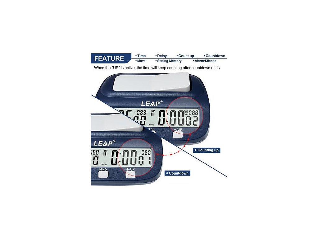 Die digitale Schachuhr LEAP PQ9923 kann sowohl von begeisterten Amateur-Schachspielern als auch von aktiven Anfängern beim Training in Schachvereinen oder Schulen genutzt werden. Die aus robustem Kunststoff gefertigte Uhr ist einfach zu bedienen und ihre Einstellungen sind einfach und intuitiv. Trotz ihrer geringen Größe bieten sie ein ausreichend großes und übersichtliches LCD-Display. Sie werden mit einer AA-Batterie betrieben. Funktionen – Unterstützt Count-Up, Count-Down, Bonus/Inkrement und Verzögerung. - Wechseln Sie automatisch zum Countdown, wenn die Countdown-Zeit abgelaufen ist. Diese Funktion kann vor Beginn der Zeit ein-/ausgeschaltet werden, wenn sie nicht benötigt wird. - Countdown-Timer bis zu 10 Stunden. - Erstellen und speichern Sie Ihren eigenen Zeitmodus für jeden Spieler und ändern Sie die Zeit während des Spiels ganz einfach. - Wenn der Timer nach dem Ausschalten wieder eingeschaltet wird, wird automatisch der zuletzt verwendete Timing-Modus angezeigt. - Der akustische Alarm kann ein- oder ausgeschaltet werden. - Großes LCD-Display. - Stromversorgung 1 Stück AA-Batterie (nicht im Lieferumfang enthalten). - Maße, Breite x Höhe x Tiefe: 14 x 3,5 x 9 cm.Zusätzliche Parameter