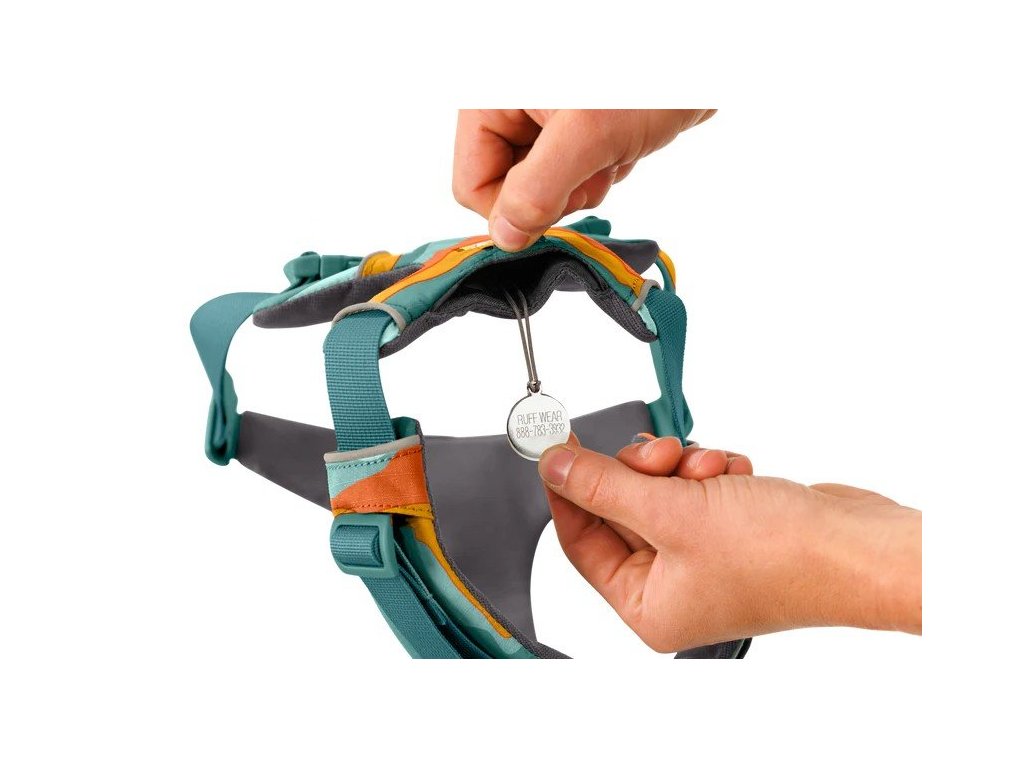 Das Geschirr ist außerdem mit einer leicht zugänglichen Tasche zum geräuschlosen Tragen von Erkennungsmarken ausgestattet und bietet reflektierende Eigenschaften Einfassung und eine Schlaufe für mehr Sicherheit bei der Befestigung von Sicherheitslichtern bei schlechten Lichtverhältnissen.