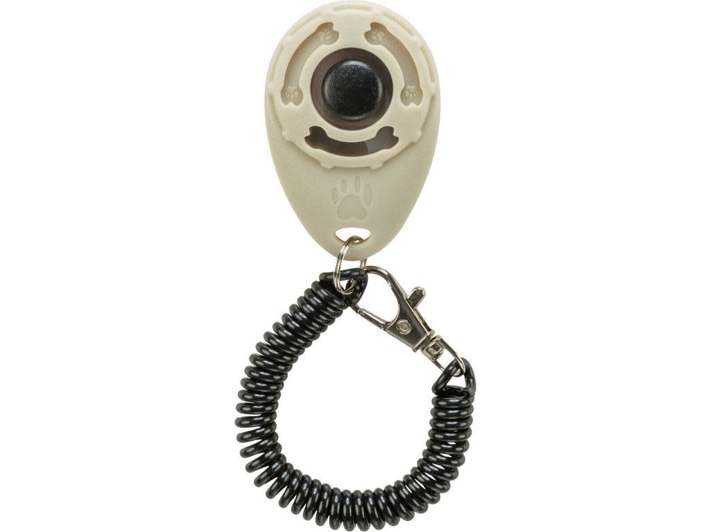 - Flexibles Spiralkabel mit Karabiner zum Aufhängen des Clickers am Handgelenk oder am Gürtel