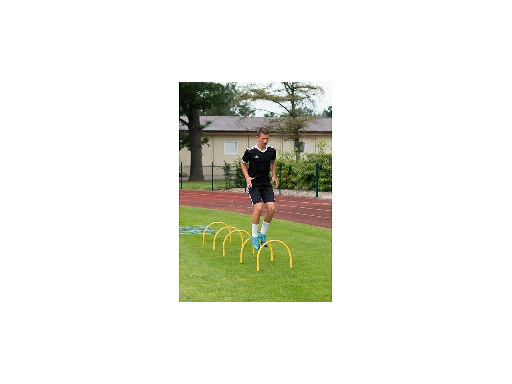 Der Trainingsbogen dient der Verbesserung der Passgenauigkeit und der Ballkontrolle. Der Merco-Trainingsbogen besteht aus einem PVC-Rohr mit 30 mm Durchmesser, an dem an beiden Enden Stahlspikes fest und ästhetisch angenietet sind, mit langlebigen Spitzen aus hochdichtem Polyethylen zum Schutz vor Verletzungen. Für eine gute Sichtbarkeit sind die Bögen fluoreszierend gelb eingefärbt. Der Merco-Trainingsbogen ist für das Training auf Rasenplätzen konzipiert. Der Bogen ist 41 cm hoch und 49 cm breit.Zusätzliche Parameter
