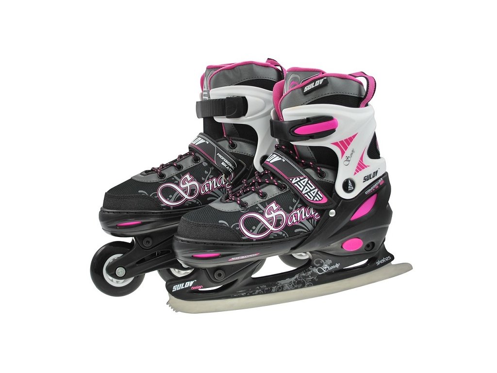 Verstellbare Schlittschuhe für Mädchen mit austauschbarem Chassis zum Eis- oder Inline-Skaten. Schnell trocknendes, atmungsaktives Futter für angenehmen Tragekomfort. Die Schlittschuhe können bei Bedarf einfach auf 4 Größen eingestellt werden, indem einfach der Knopf an der Seite in der Ferse des Schlittschuhs gedrückt wird. - Außenmaterial: widerstandsfähiges PP, technisches NYLON, kältebeständiges PVC - Innenmaterial: verstärktes NYLON, Thermofutter, Komforteinsatz, der sich an die eingestellte Größe des Skeletts anpasst - eine doppelseitige Schnalle mit AUTO LOCK, Klettverschluss, Schnürung - rostfrei Hockeykufe aus Stahl - Chassis für Inline-Skating: - Räder PU 82A Größe S - 64 x 24 mm / Größe M, L - 70 x 24 mm - Lager ABEC 5 Kohlenstoffstahl Zweck: Freizeitsport Größen: S (31-34), M (35-38), L (39-42)Zusätzliche Parameter