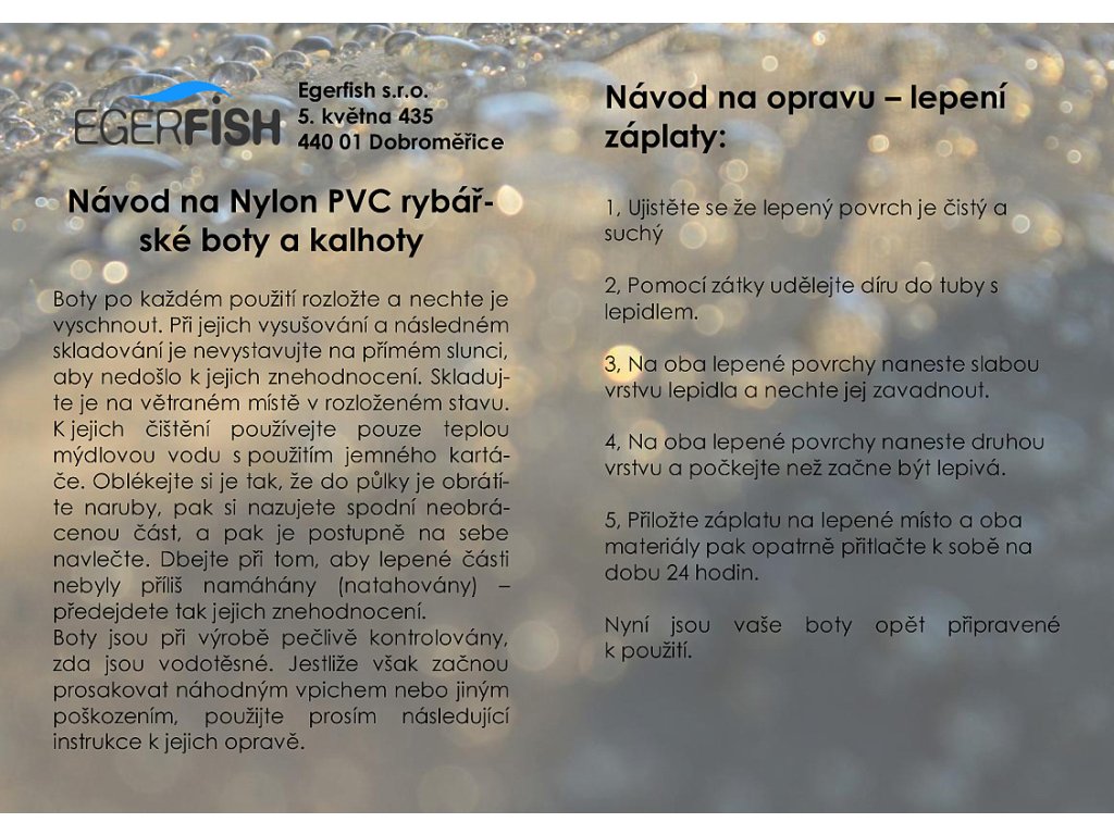 Wading shoes made of very durable nylon fabric coated with PVC - material 70D Nylon. The double seams are taped, the molded rubber shoe with a non-slip molded sole is welded to the fabric with a double weld. The belt straps with a plastic clip are made of solid material interspersed with rubber for more comfortable movement in the water. The shoes come with a patch and glue. How to proceed when gluing the patch: * Make sure the glued surface is clean and dry. * Use the stopper to make a hole in the glue tube. * Apply a thin layer of glue to both glued surfaces and let it set. * Apply a second layer to both glued surfaces and wait until it starts to stick. * Apply the patch to the glued area and then carefully press the two materials together for 24 hours.Additional parameters