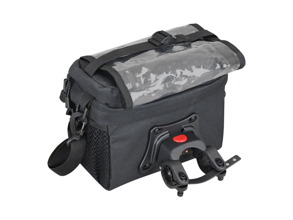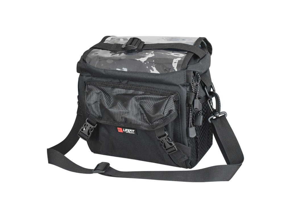 Lifefit Handlebar Bag - 1 main and 1 top zippered pocket - 2 side mesh pockets - 1 front pocket with snap buckles - top transparent map sleeve - protective rain cover - adjustable shoulder strap - made of durable material with a repellent finish water - internal reinforcement - reflective elements - fastening with a QUICK CLIP lock to MTB bicycle handlebars (diameter approx. 3.1 cm - without pad; approx. 2.5 cm - with pad) - dimensions: 24 x 22 x 14 cm (w x h x d )Additional parameters