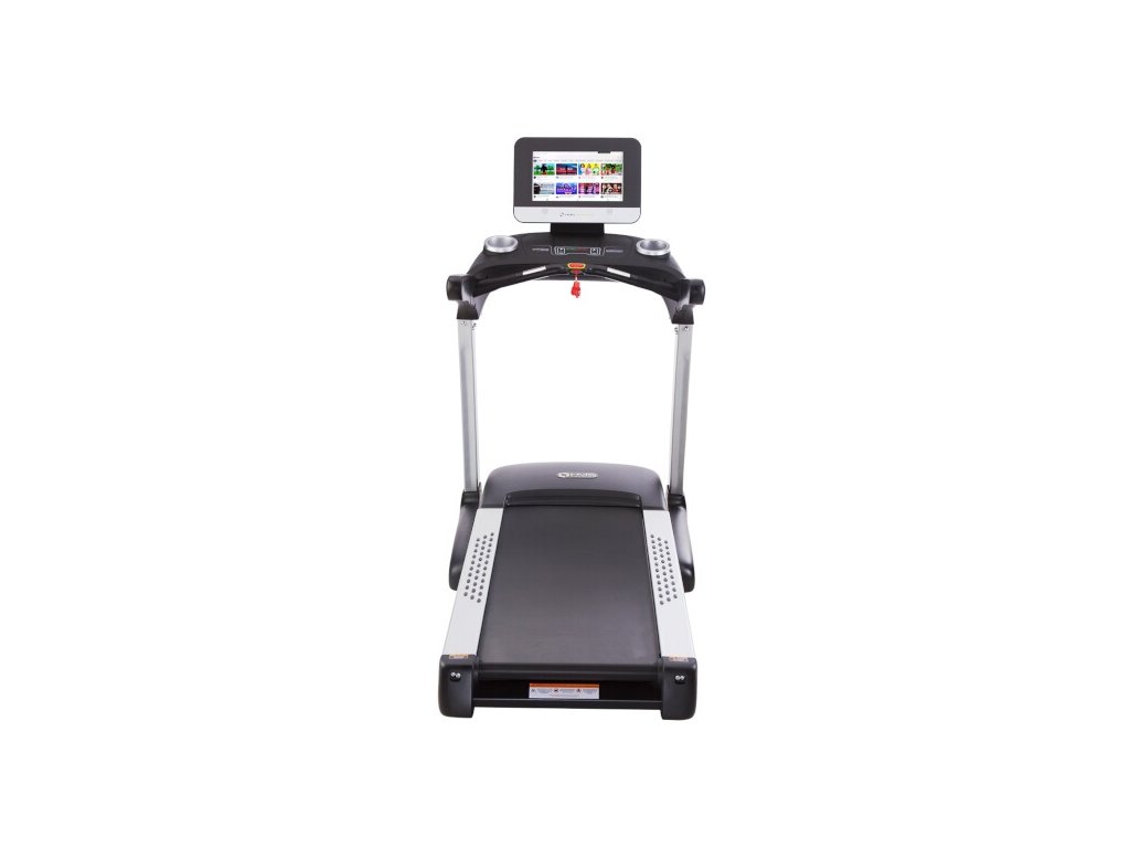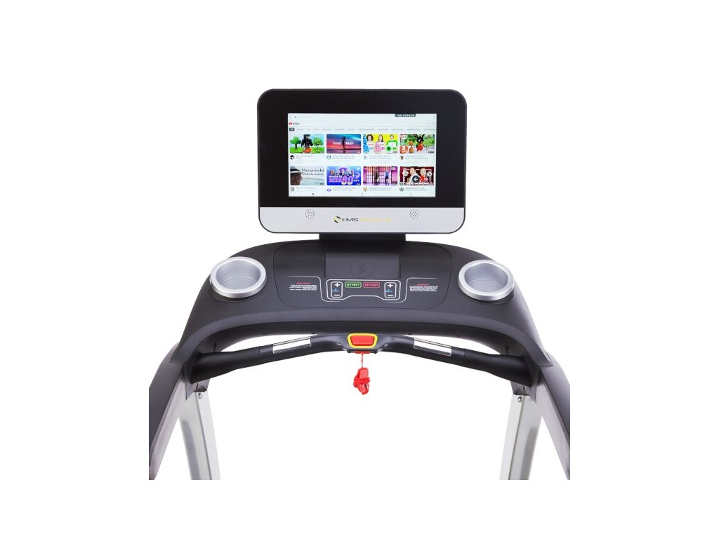 The large and clear control console is equipped with a safety lock that stops the belt in the event of a fall, handles for measuring heart rate and two holes for, for example, a water bottle .