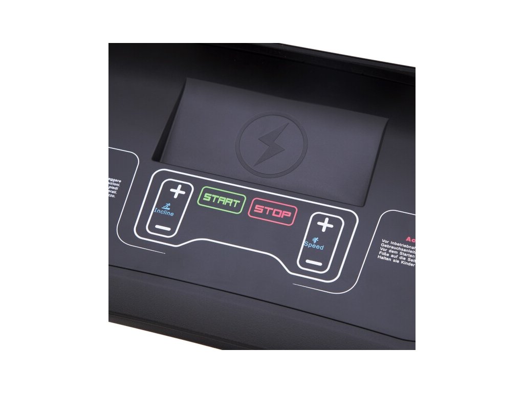 The mechanical keyboard includes "START", "PAUSE/STOP" buttons to start, pause and end training. A pair of buttons for smoothly changing the speed of the running surface and a pair of buttons for setting the slope of the running surface. Above the buttons there is a cut-out for storing a mobile phone, which also serves as a wireless charger. On the side of the console, we find a 3.5 mm input for connecting headphones and a USB connector for connecting a USB flash drive or a mobile device.