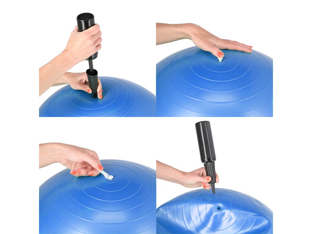 The gymnastic ball is made of very durable rubber with a non-slip surface. The package includes a hand pump that can be used to inflate the ball, a plug and a device for removing the plug from the ball. The diameter of the ball should correspond to the height of the character, for the correct selection, see the overview table below.