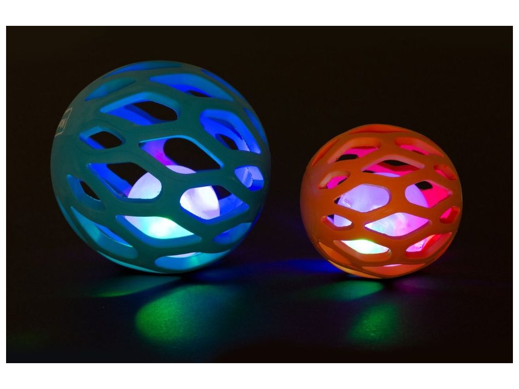 A popular dog toy with a small LED ball inside that activates when shaken and lights up in different colors. The battery integrated in the illuminated ball cannot be replaced. However, since the energy-saving LED only lights up when the toy is in use, it lasts a very long time. The outer mesh ball is robust and, thanks to its shape, is suitable for both dogs and owners. The ideal toy for poor visibility. Suitable for throwing, catching and pulling. The ball also makes sounds. Available in two sizes.