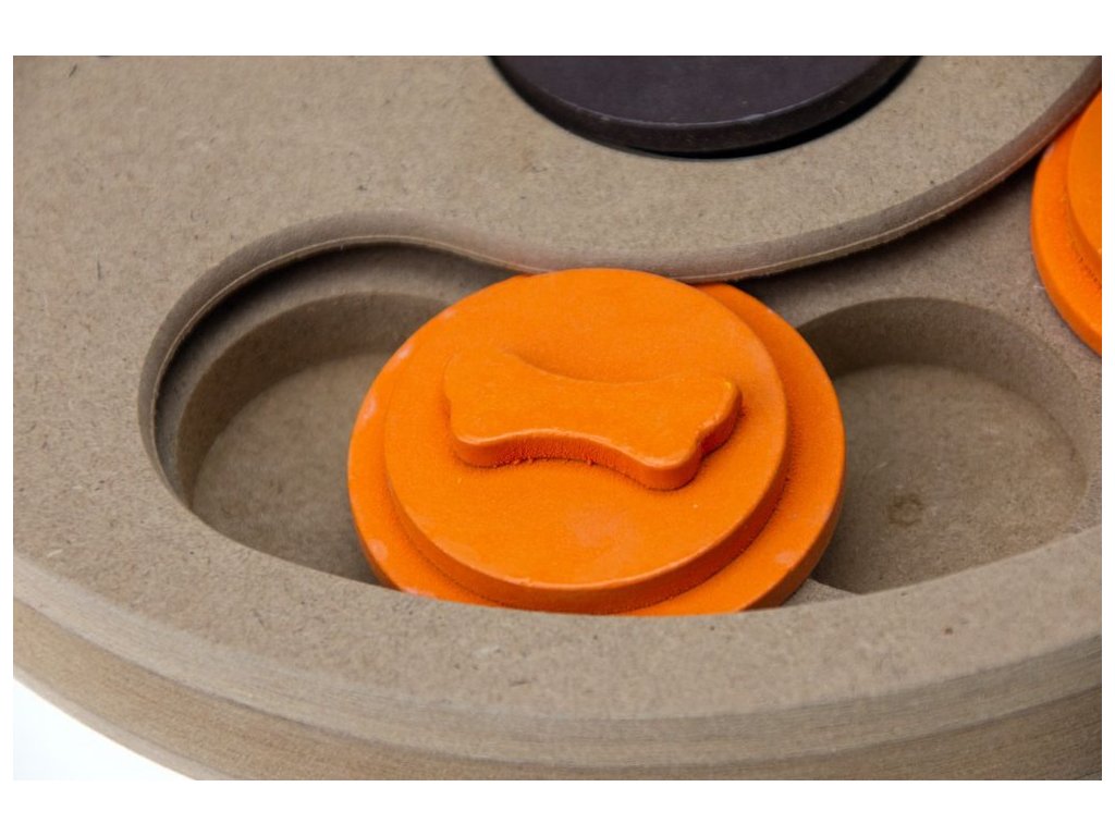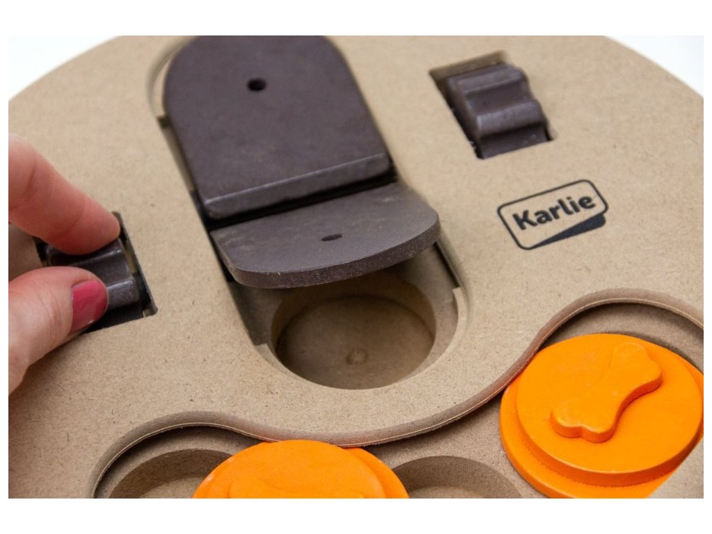 In addition to physical activity, it is also important to train your dog mentally regularly for a happy life. In this regard, the Karlie Dog Toys from the Doggy Brain Train series provide a meaningful activity. The dog searches for its reward by opening the shelters by sliding the panels and lifting the hatch. Owners can help and first guide the dog to the right track. This intense interaction strengthens the human-animal bond and helps the dog build trust. The stable and high-quality wooden board is robust and has a diameter of 23 cm.