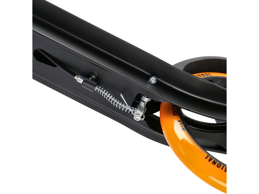 The rear fender serves as a pressure brake, which further emphasizes the braking effect of the mechanical brake controlled by a cable from the lever on the handlebars, which are equipped with rubber grips that ensure a firm and comfortable grip. The handlebars are height adjustable to 3 levels. The large wheels are equipped with ABEC 7 bearings and a polyurethane tire with a diameter of 200 millimeters. This combination ensures a fast, smooth and safe ride.