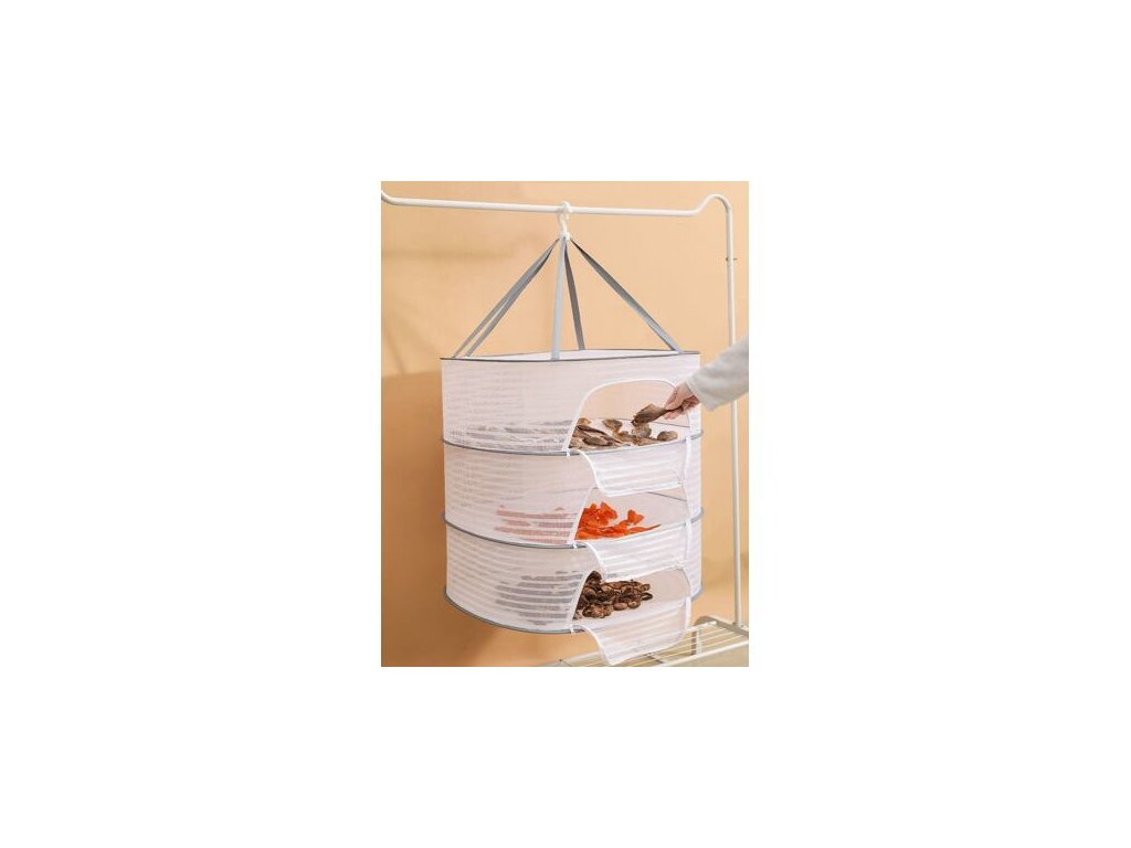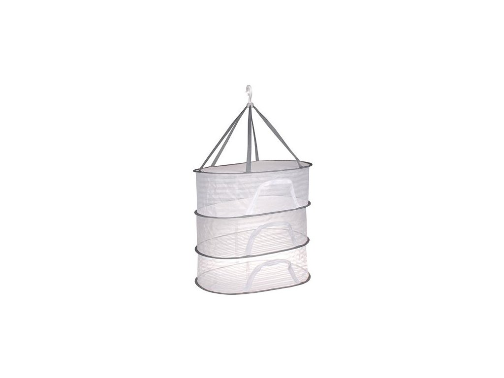 The hanging drying net Multifunctional 3 offers a simple solution for drying herbs, flowers, fruits and mushrooms. An oval-shaped net with dimensions of 40 x 60 cm and a height of one drying floor of 20 cm (3 floors in total of 60 cm) creates sufficient space for drying plants. You can quickly and easily attach the net to the upper plastic hook that holds the net on the textile straps. The advantage of this folding net with three layers is access from the side to the classic zipper. Dry herbs and plants in the comfort of your home with the Multifunctional 3 drying net. Parameters: - width: 40 cm - length: 60 cm - height: 60 cm - weight: 400 g - material: polyester mesh, steel rings, plastic carabiner - advantages: saving space, separate floors, simple storage