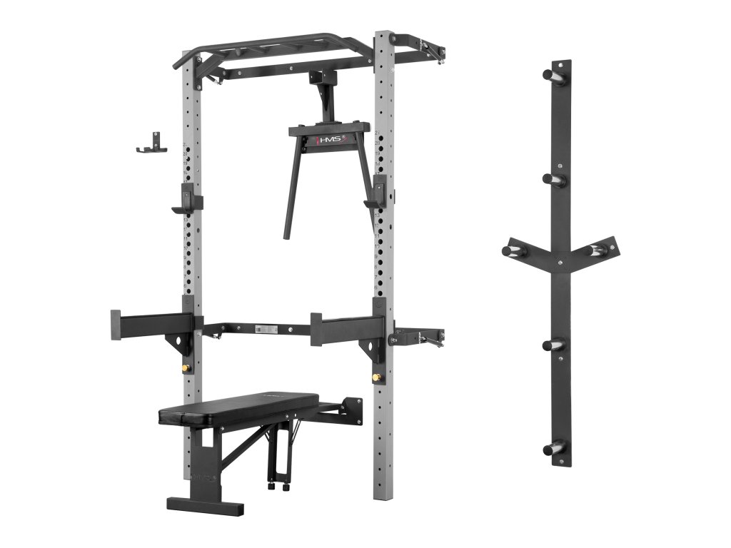 The folding power rack - Power Rack KLT22 from HMS was designed to meet current market trends and meet the expectations of the most demanding customers. The rack in this variant is sold with additional equipment. In addition to a barbell, barbell hooks, and safety supports, you'll find a folding flat bench, a dip adapter, a wall-mounted barbell rack, and an axle holder. Such a set will expand your training possibilities and give you new storage spaces for your equipment.