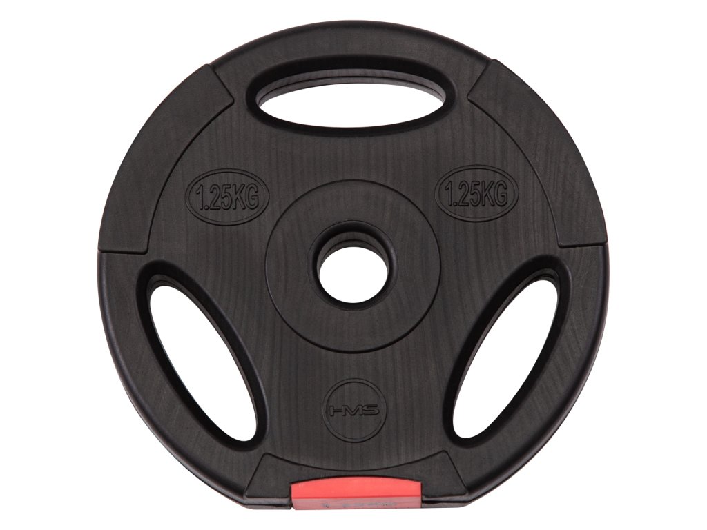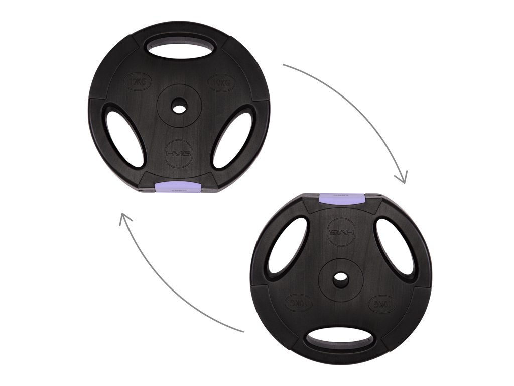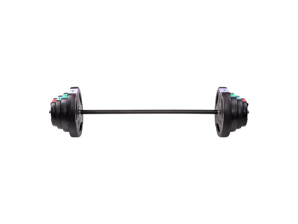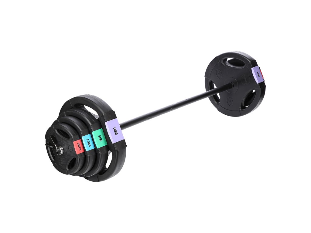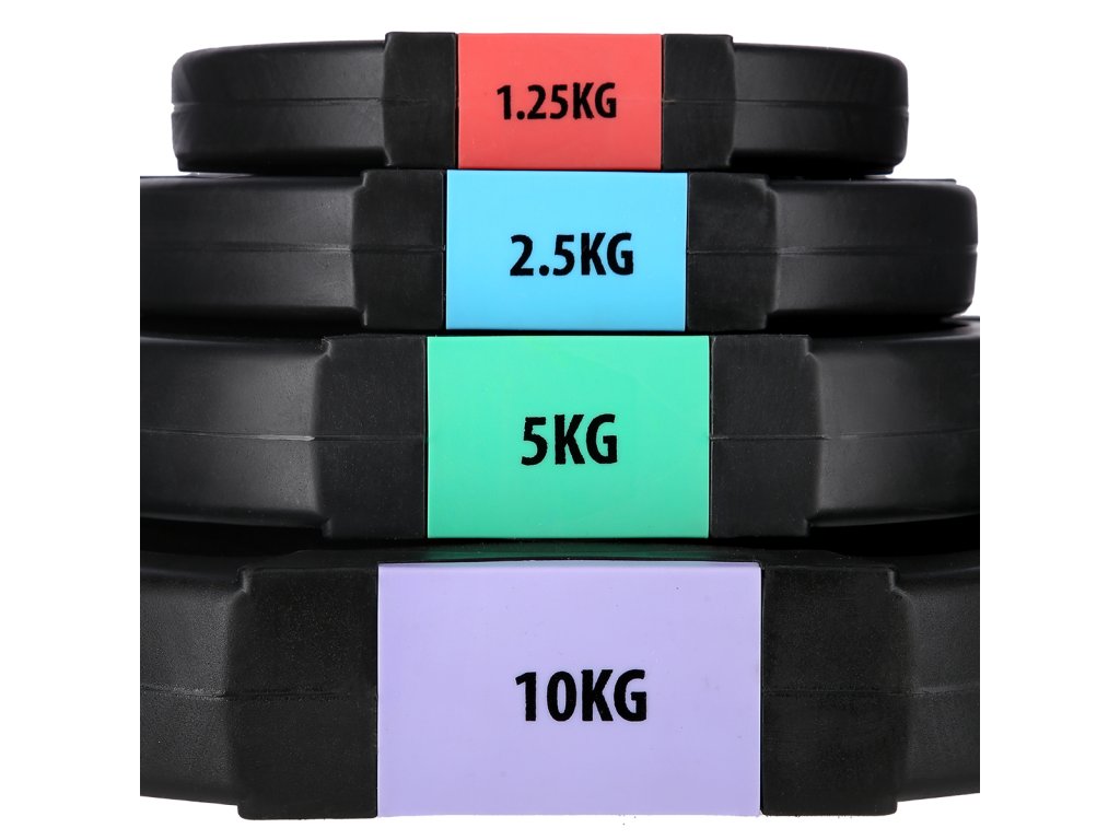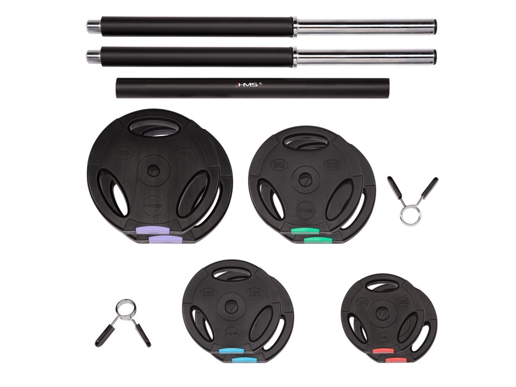 Discs are made of hard plastic that is filled with cement. The two-arm axis is made up of three parts, which are assembled with the help of screws. The loading pins are smooth and the weights are secured with spring clamps.