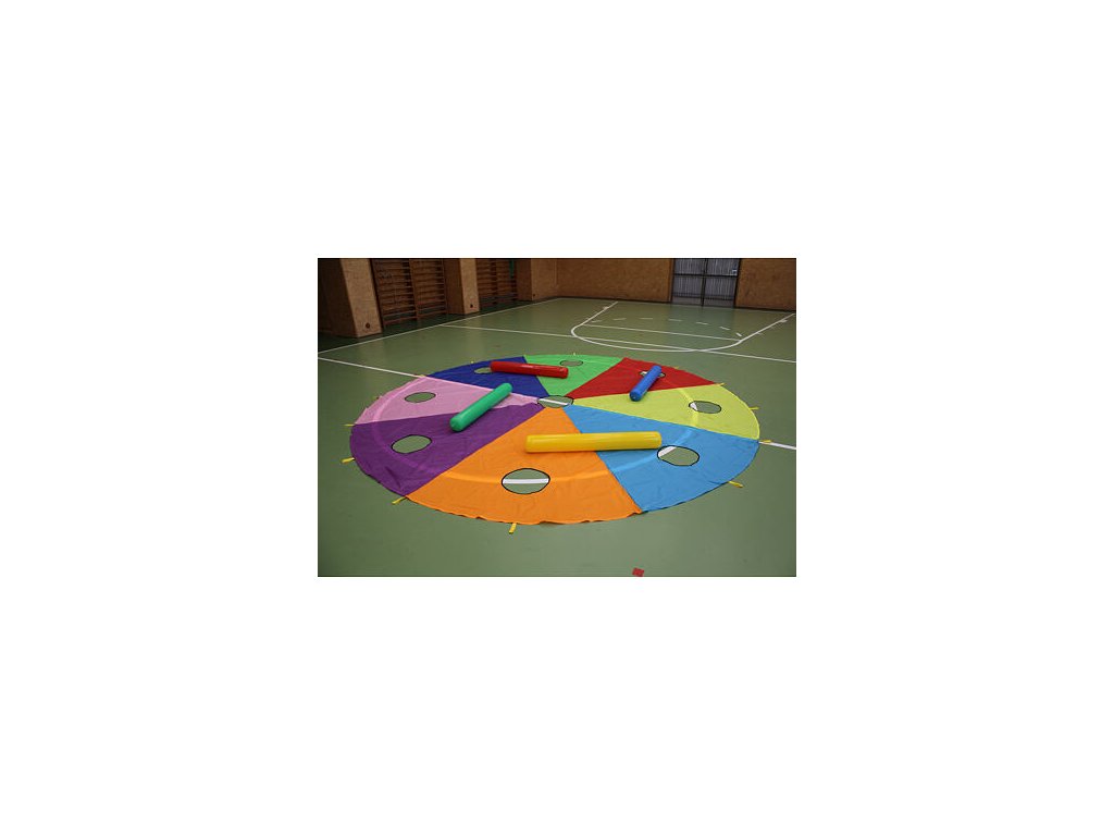 The Merco Parachute Play didactic aid is primarily intended for games and the development of the coordination of the entire group of participants around the parachute, under it or on its surface. The parachute helps to practice the sense of interplay. It is therefore particularly suitable for teachers or camp leaders to organize the activities of a whole group of children, either in nature or in the indoor spaces of the gym. The Parachute is made of very light polyester, sewn from pastel colored parts with lined circular holes with a diameter of 30 cm and one hole right in the middle. There are loops around the entire outer circumference for gripping and tensioning the ring. The package also includes four 100 cm long inflatable clubs for the popular children's game "mole", where one of the players is in the center hole of the circle and tries to hit as many "moles" as possible with the club, which pop their heads out of the holes around them in a moment , when the player with the inflatable club in the middle is inattentive. The diameter of the entire circular parachute varies depending on one of the two sizes offered. Diameter Number of holes Number of parts Number of children 4 m 9 8 10 – 20 5 m 13 12 15 – 30Additional parameters