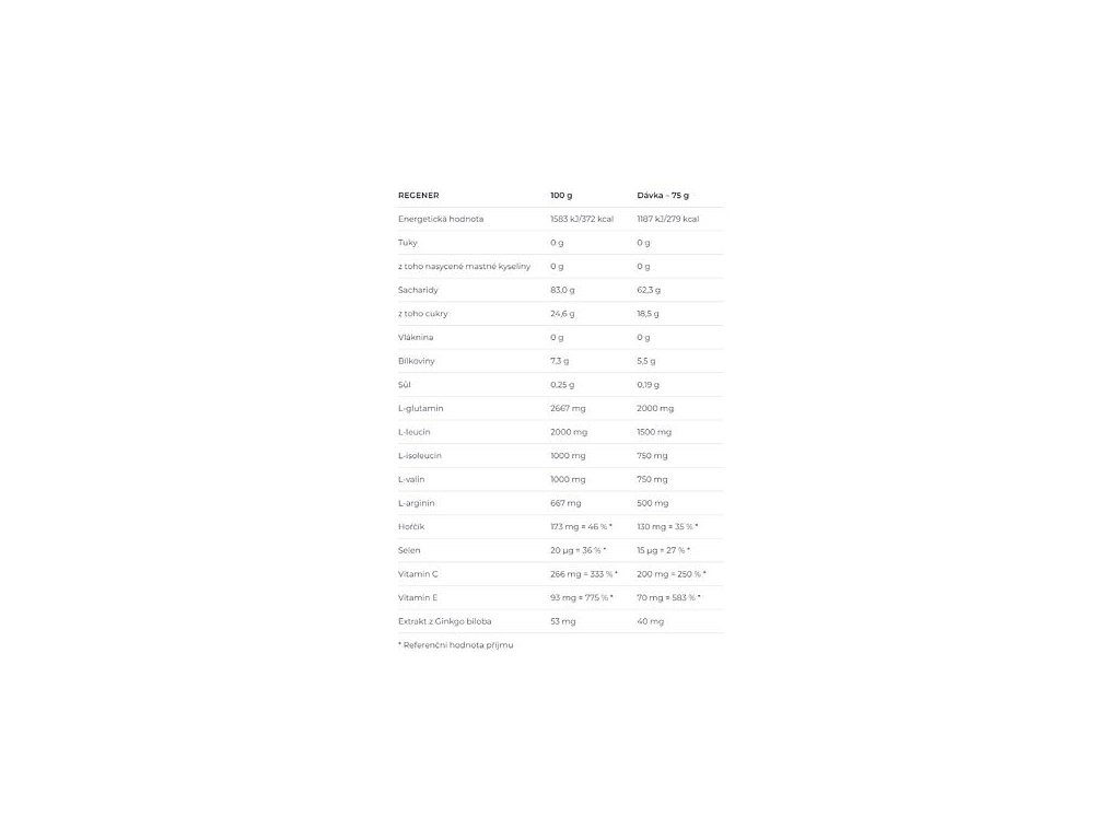 An extremely effective combination of carbohydrates, amino acids, vitamins and minerals, specially created to support high-quality and fast regeneration after intense sports performance. 62 g of carbohydrates in a dose of 3,000 mg BCAA in a dose of 2,000 mg L-glutamine in a dose of 500 mg of L-arginine in a dose of magnesium and selenium vitamins C and E ginkgo biloba extract without artificial colors instant mixture Recommended dosage: mix immediately after physical activity 75 g in 450 ml of water and drink in portions over 20-30 minutes. Then drink the contents with another 200 ml of water. Do not exceed the recommended dosage. Warning: Dietary supplement, with sugars and sweeteners. It does not replace a varied diet. Not intended for children, pregnant and lactating women. It may reduce blood clotting. Protect from heat, frost and moisture. Ingredients: Fresh apple flavor: maltodextrin, glucose, L-glutamine, L-leucine, acidity regulator citric acid, aroma, magnesium citrate, potassium gluconate, L-isoleucine, L-valine, L-arginine, anti-caking agent calcium phosphate, L-acid -ascorbic acid, thickener carrageenan, sodium chloride, DL-α-tocopheryl acetate, sweeteners sucralose and acesulfame K, Ginkgo biloba extract (24% flavones), beta-carotene dye, organically bound selenium from yeast. The product may contain traces of soy and milk proteins. Red fresh flavor: maltodextrin, glucose, L-glutamine, L-leucine, acidity regulator citric acid, magnesium citrate, potassium gluconate, L-isoleucine, L-valine, L-arginine, anti-caking agent calcium phosphate, beetroot concentrate, acid L-ascorbic acid, aroma, thickener carrageenan, sodium chloride, DL-α-tocopheryl acetate, sweeteners sucralose and acesulfame K, Ginkgo biloba extract (24% flavones), color beta-carotene, organically bound selenium from yeast. The product may contain traces of soy and milk proteins. Supplier: NUTREND DS, as, Chválkovice 604, 779 00 Olomouc, Czech RepublicAdditional parameters
