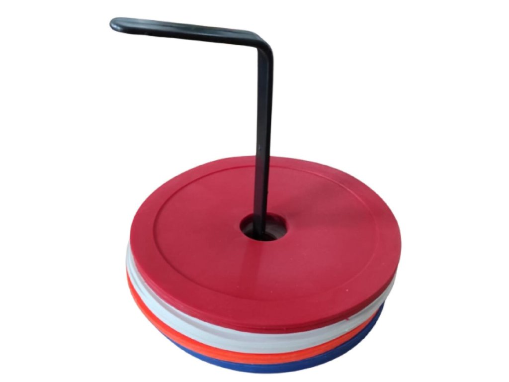 set of 16 Ring floor markers including a stand for easy portability and storage. The Ring floor marker is a practical training aid, thanks to which the trainer can create an agility course or demarcate an exercise zone in no time. The circle-shaped floor marker is made of thermoplastic rubber (TPR), which stands out for its durability, making the marker suitable for outdoor training and gyms. The ring brand has an overall diameter of 15 cm, an inner hole diameter of 2.5 cm and a weight of approximately 50 g.Additional parameters
