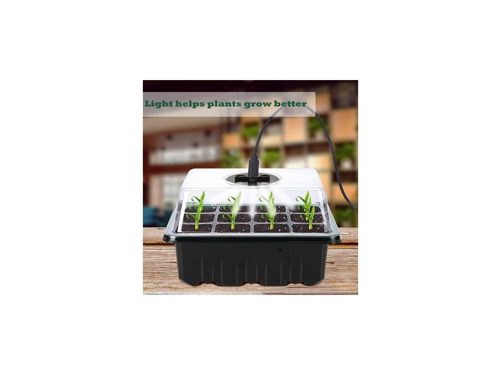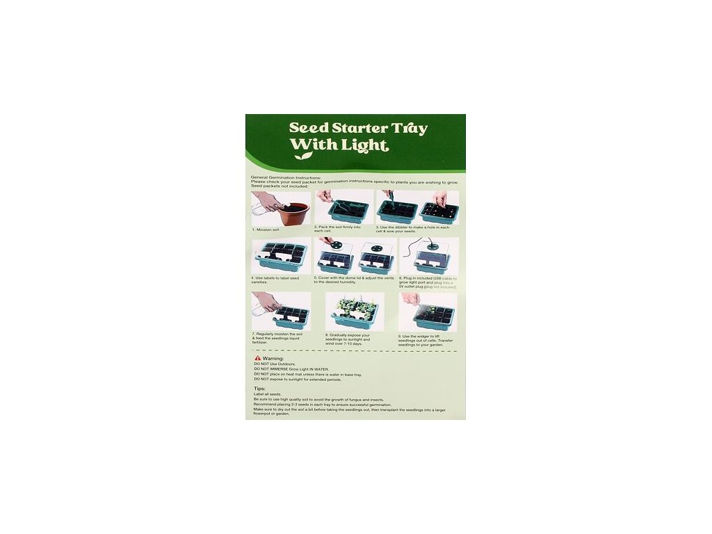 Do you enjoy gardening and growing your own plants from seeds? Then the Seedling Pot 12 Light mini greenhouse is ideal for you. This small glass is used for pre-growing seedlings, cutting plants and germinating seeds. The Seedling Pot 12 Light is made of PET plastic and consists of a green saucer, a transparent seedling insert with holes for water drainage, a transparent lid for adjusting the air flow, LED lighting, 10 notches for marking the seedlings and a plastic mini gardening tool . Each mini hotpot has 12 holes for seedlings and the whole Seedling Pot 12 set contains 5 pieces of mini hotpots. One mini-steamer has dimensions of 18.5 x 16 x 14.5 cm (WxHxD) and a big advantage over competing mini-steamers is the high enough lid. Instructions: 1) Moisten the soil, preferably with a sprayer. 2) Use a plastic mini shovel to fill the holes with soil. 3) Use a mini planting stake to make holes for the seeds or cuttings. Place the seeds in the holes. 4) You can use white notches to mark the plants. 5) Close the steamer with the transparent lid and adjust the air flow (microclimate) with the green wheel. 6) Plug the USB cable into the green circle (and then the adapter into the socket - the adapter is not included in the package), this will start the light. 7) Moisten the soil regularly, you can also add fertilizer. 8) Place the steamer in a bright and warm place. 9) You can use the second included mini tool to remove the seedlings. Tips: Mark all the seeds. Use good quality soil to avoid possible pests and plant mold. We recommend planting 2-3 seeds in each flowerpot to increase the chance of successful cultivation. Before removing the seedlings from the flowerpots, let the soil dry slightly, then they will be easier to remove. Package contents: 5 pcs. plant identification 2 pcs of mini garden tools 1 pc of USB cable with 5 terminals Material: PET plasticAdditional parameters
