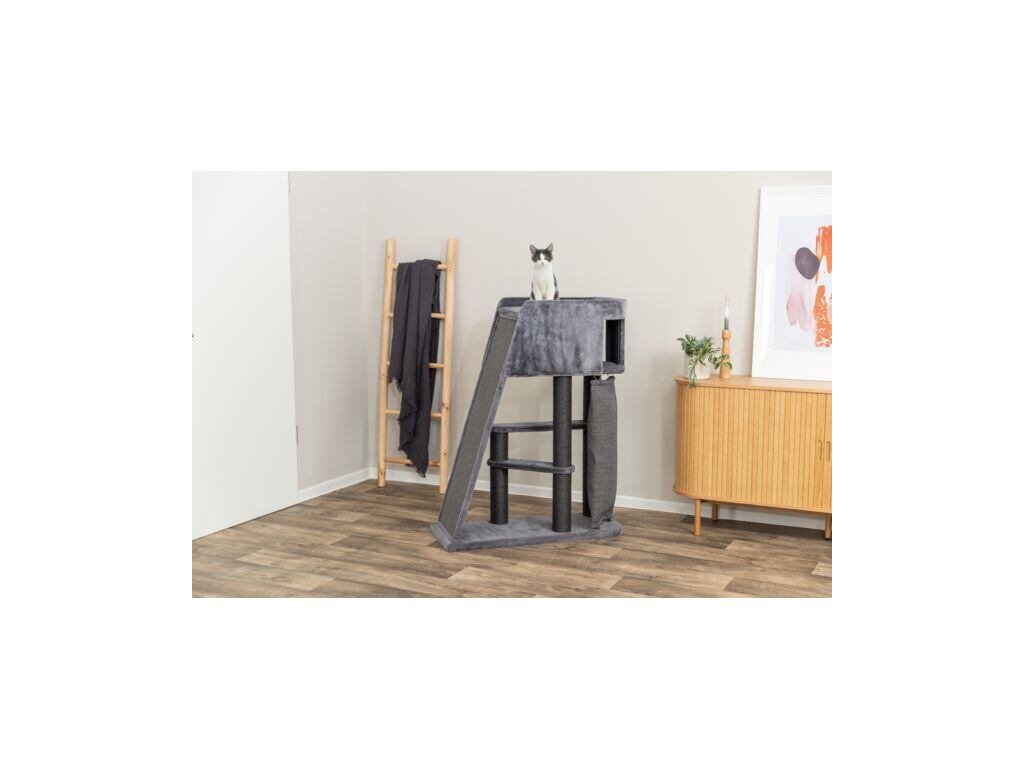 design scratching post in CityStyle made of plywood with wood decor, cave lined with double-sided pillow, bed lined...