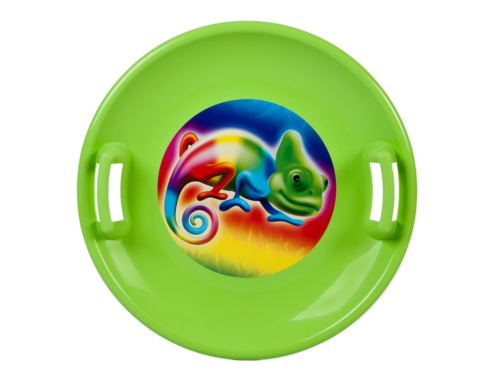 Round saucer-shaped glider with playful motifs. - two side handles - durable plastic material - made in the EU Maximum load capacity: 90 kg Dimensions: 60 x 60 x 7.5 cm (w x dxh) Mix of prints. Photo for illustrative purposes only.Additional parameters