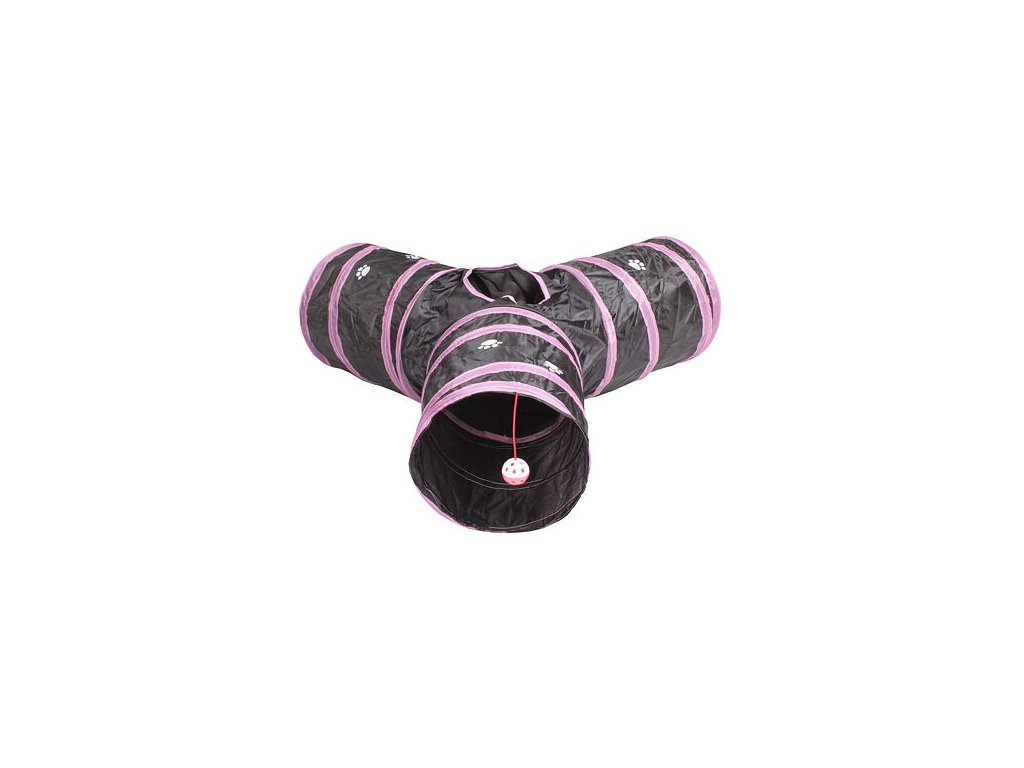Agility tunnel Y Three-way is a great tool for the development of movement activities and interactive entertainment of your four-legged friends. The Y-shaped tunnel has three exits each 35 cm long. A plush ball with a bell is suspended from one of the ends, which serves as an incentive to play, especially for cats. The 25cm diameter 'sleeves' are connected and there is another 15cm diameter hole in the middle for your pet to explore. Due to its dimensions, the tunnel is suitable for small breeds of dogs, puppies, cats and domestic rabbits. The tunnel is made of breathable polyester with embedded spiral wire in the wall. It is available in two colors: white-grey and black-pink. The Y Three-way can be taken with you almost anywhere thanks to its compactness and weight of 275 g. The tunnel unfolds and folds in seconds and secures with an elastic band. You will have a lot of fun with your pet with the Y Three-way agility tunnel.Additional parameters