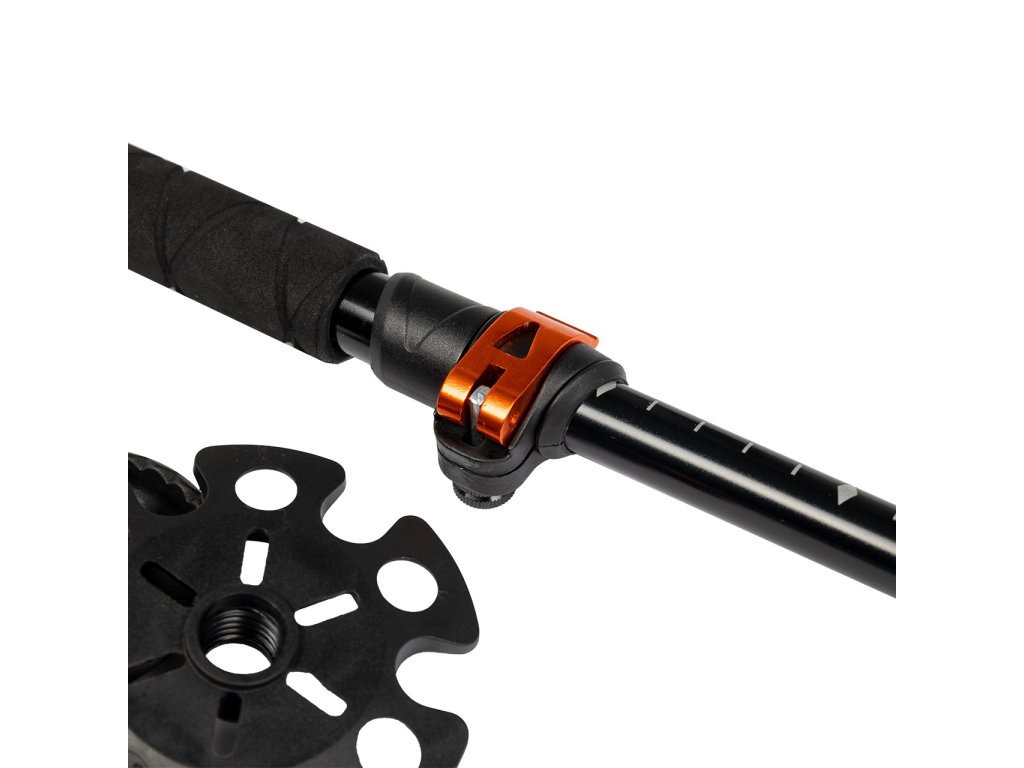 Modern ultra-light aluminum folding walking stick with extended handle. Thanks to the folding system with a rope, the poles are assembled quickly and firmly. The upper sliding part with the SPEED LOCK clamp is used to set the desired length. The extended foam handle and the adjustable strap made of a soft strap are comfortable to hold and do not rub your hand anywhere. Steel spikes. The poles are supplied in a shipping case along with two plates (large and small) and tip covers.