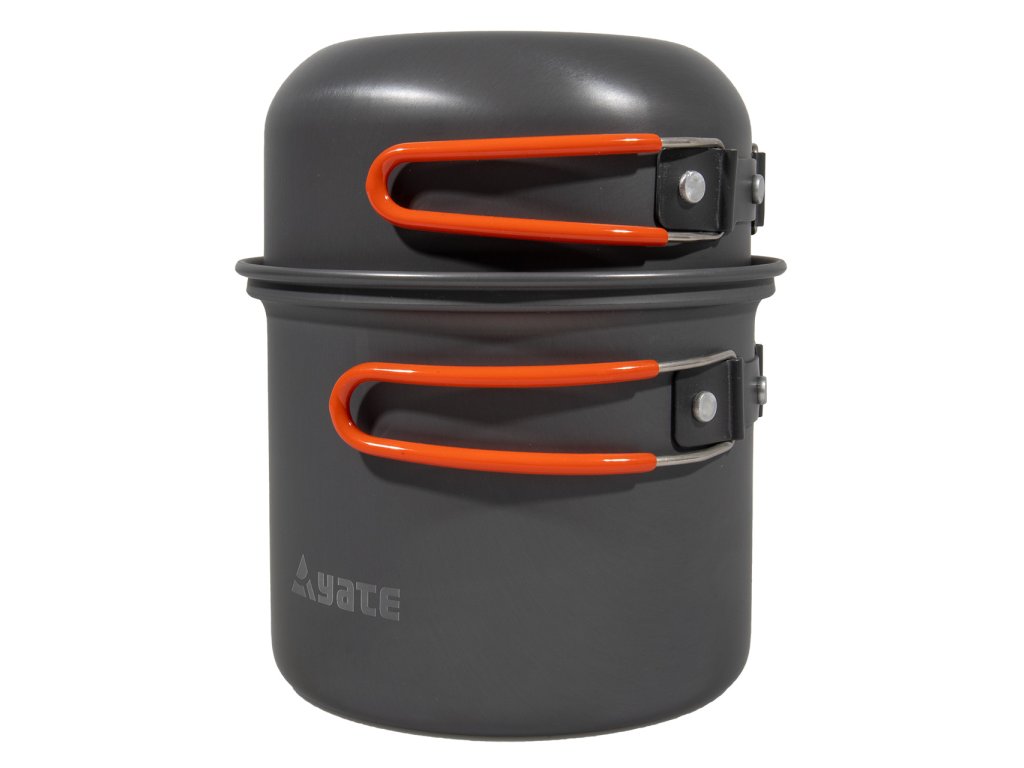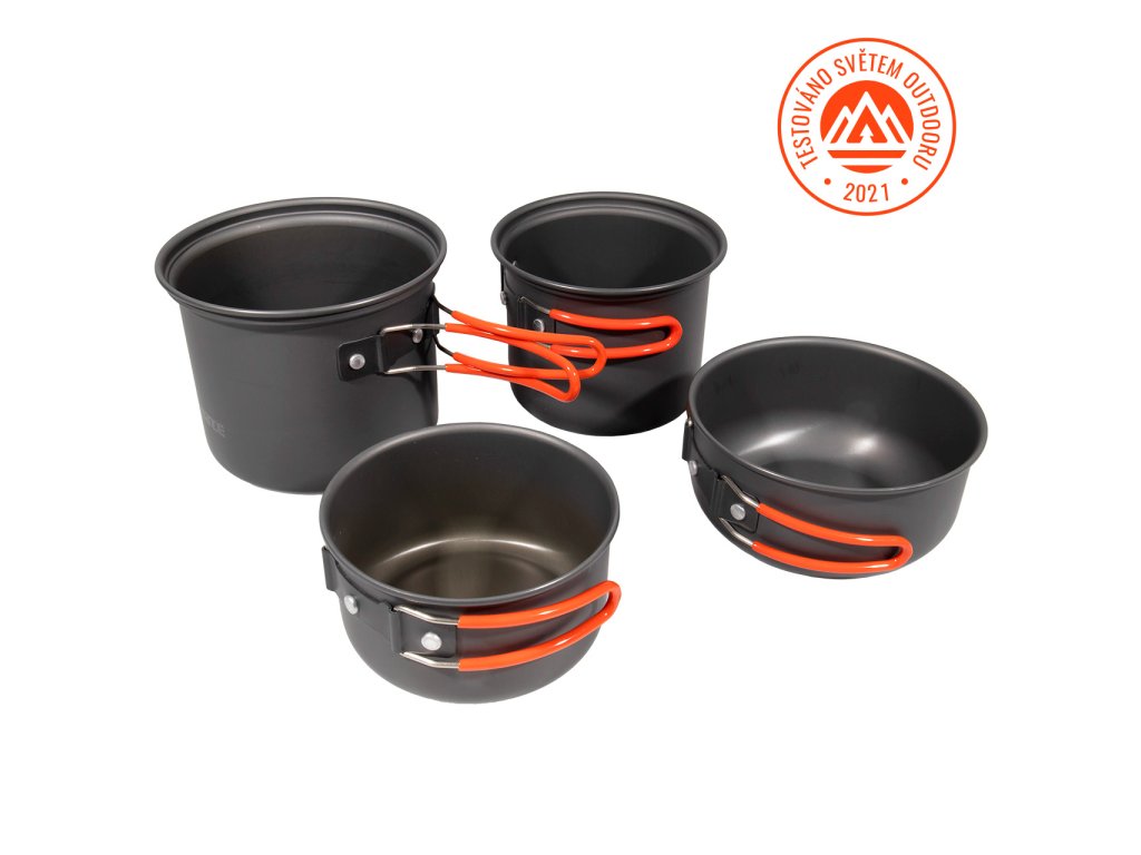 Dish set for 3-4 people made of anodised food-grade aluminium, which is resistant against abrasion. The handles are protected by silicone against burns and are comfortable in the hand. Supplied with transport packaging. Very light and compact. The pot can comfortably fit a gas cartridge (300 g in the small pot, 300 and 500 g in the large pot) and a cooker.