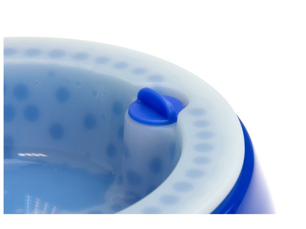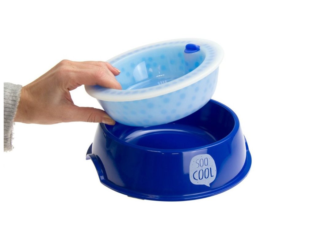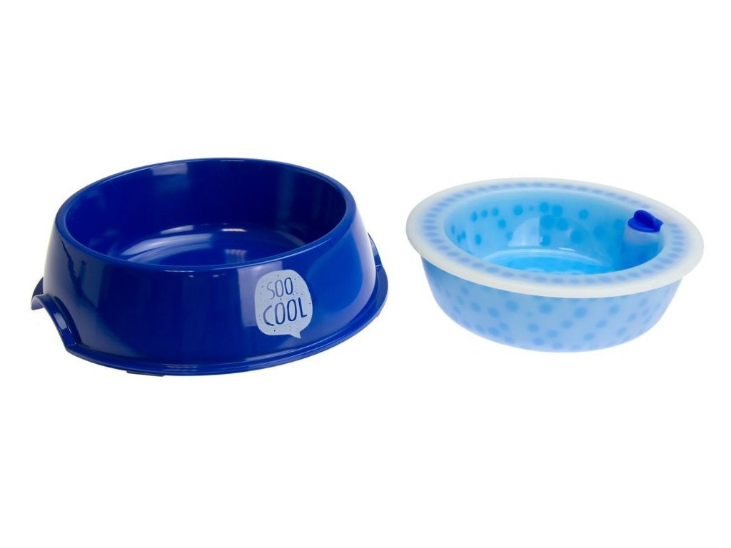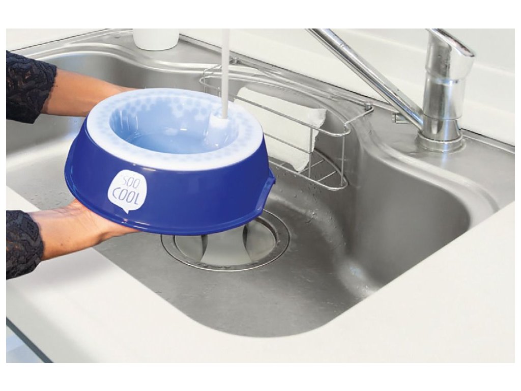 Modrá plastová miska s ozdobným potiskem „SOO COOL“ v zábavné bublině je ideálním doplňkem pro teplé letní dny. Chladicí vložka v misce je naplněna speciálními gelovými kuličkami. Pro dosažení chladicího účinku umístěte vložku do lednice a poté vložte do mísy. Jídlo nebo voda pak zůstává příjemně chladné a svěží. Při standardních teplotách lze plastovou misku samozřejmě použít i bez chladicí vložky. Čtyři ploché gumové nožičky zajišťují stabilitu a zabraňují klouzání misky.