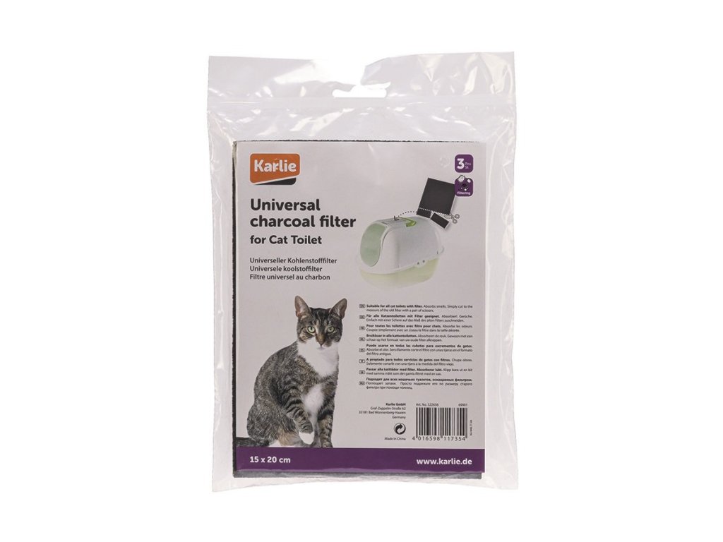 Univerzální filtry pohlcují nepříjemné pachy. Jsou vhodné pro všechny kočičí toalety. Filtr o rozměrech 15 x 20 cm lze zastřižením jednoduše upravit na požadovanou velikost. Balení obsahuje 3 filtry.