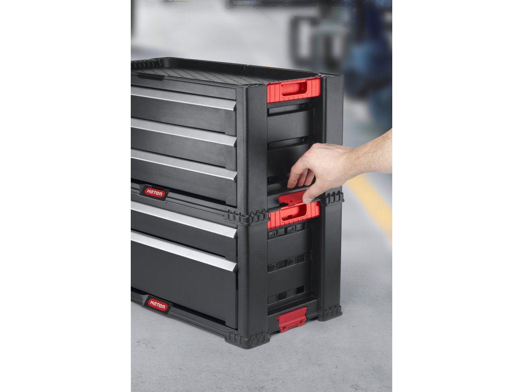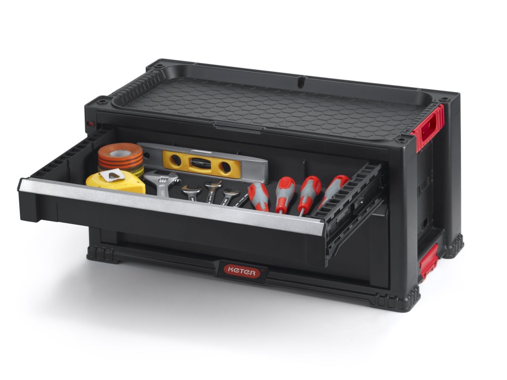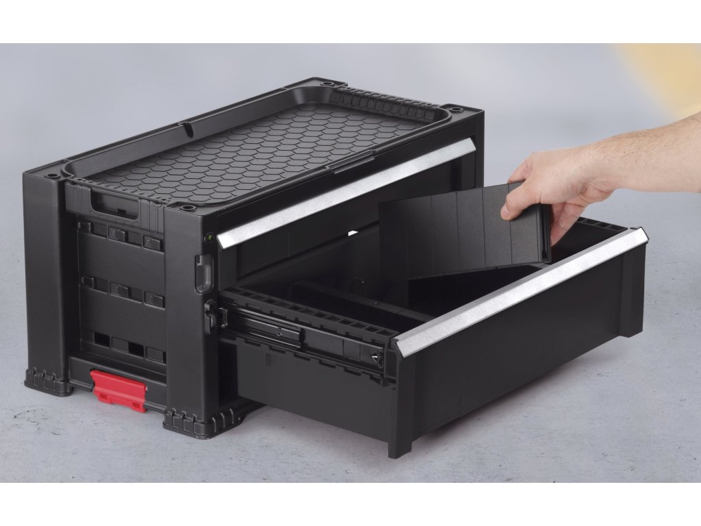 2zásuvková skříňka na nářadí. Obsahuje hlubokou zásuvku s vyjímatelnou přepážkou na větší a těžší nářadí. Praktická police s velkým objemem, která umožňuje uskladnit nářadí různé velikosti v pohodlných přepážkách. Výrobek disponuje 2 objemnými zásuvkami, což umožňuje seskupování předmětů. Hluboká zásuvka s vyjímatelnými přepážkami usnadňuje skladování větších a těžších nástrojů. Ostatní menší zásuvky jsou určeny na jiné nástroje, menší předměty a doplňky.
