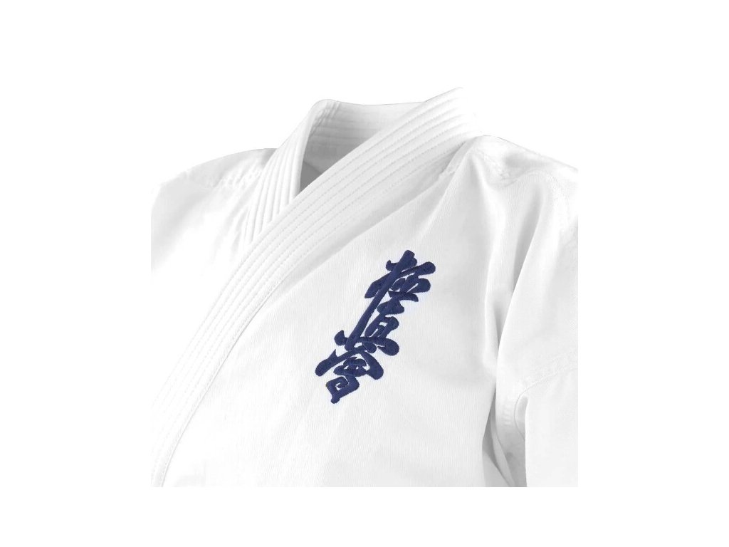 Blůza kimona má široké spadlé rukávy v 3/4 délce a tmavě modrou výšivku Kyokushin na levé straně hrudi, která jí dodává osobitý vzhled.