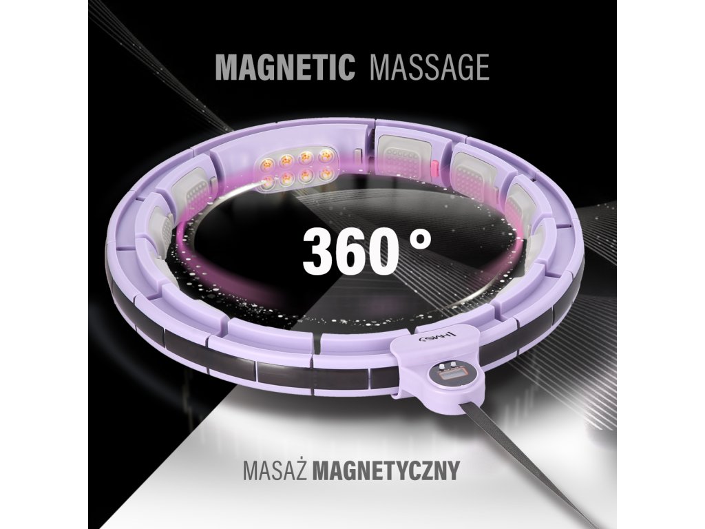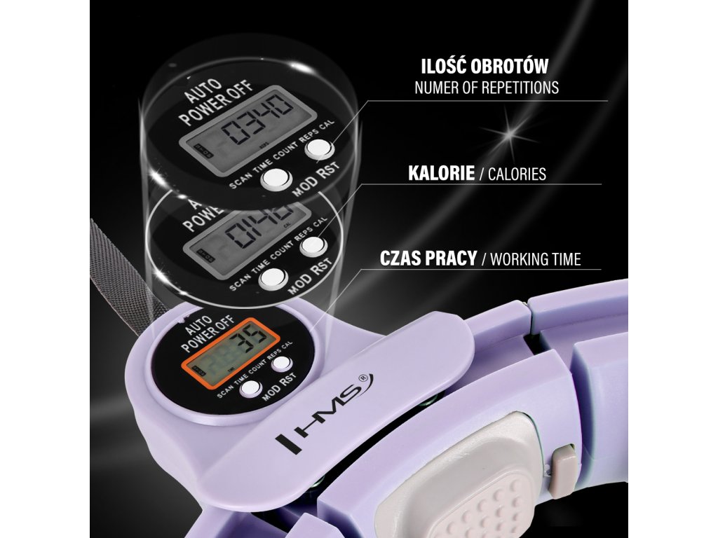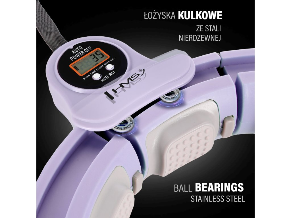 HMS HHM13 je hula hoop obruč s nastavitelným obvodem, masážními výstupky, blokem pro magnetickou masáž rotujícím závažím a přehledným počítadlem.