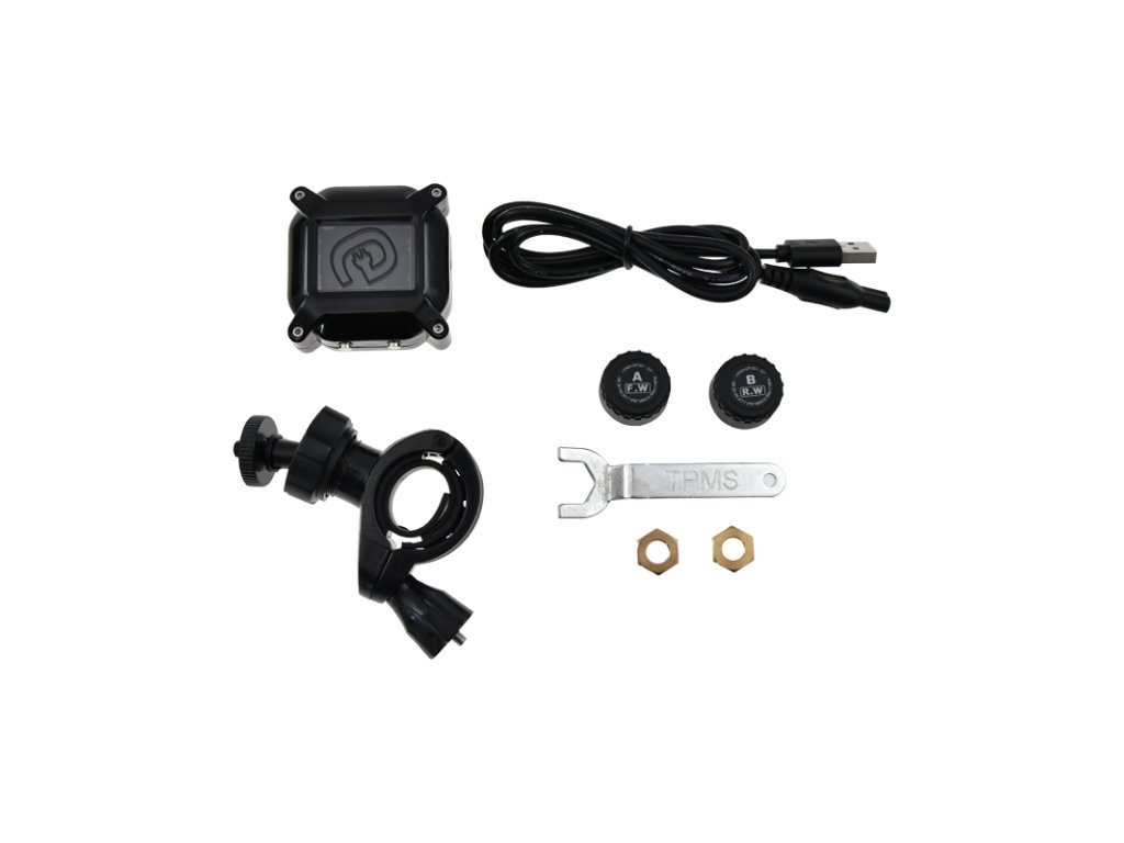 TPMS snímače tlaku v pneu motocyklu M3 - externí Externí senzory – snadná instalace, pohodlná výměna Umístění displeje pomocí plně nastavitelného držáku s objímkou, max průměr 30mm Vyměnitelná baterie pomocí přiloženého klíče Typ baterie CR1225 předpokádaná životnost ~ 1rok Displej s integrovanou dobíjecí bateriíí a USB micro konektorem Monitorujte tlak a teplotu pneumatik v reálném čase Odolnost vůči prachu a vodě Pojistná matice proti krádeži Alarm nízkého/vysokého tlaku vzduchu a vysoké teploty – nastavitelné Alarm úniku vzduchu (defektu) a slabé baterie Bezdrátové připojení se senzory (pracovní frekvence FSK433.92MHz) Dvě jednotky (PSI / Bar), které lze měnit Rozsah senzorů: 0 – 8 Bar Přesnost senzorů: 0,1 Bar Pracovní teplota: - 40 ~ + 85 Hmotnost čidla s pojistnou maticí: 5g V balení : displej, držák s objímkou, 2 senzory již obsaující baterii, 2 pojistné matice, dotahovací klíč, klíč na výměnu baterie, kabel USB – USB microDoplňkové parametry