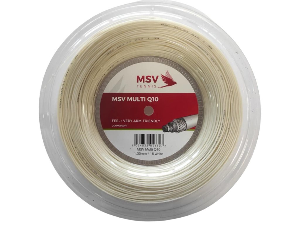 MSV Multi Q10 je moderní multifilamentní tenisový výplet, který je navržený s důrazem na maximální komfort, cit při hře a šetrnost k paži. Díky své konstrukci je ideální volbou pro hráče, kteří hledají pohodlný výplet s velmi dobrým přenosem energie a stabilním chováním při úderech. Výplet se skládá z více jemných vláken, která zajišťují měkčí odezvu, vyšší elasticitu a lepší tlumení vibrací. To ocení zejména hráči s citlivější rukou nebo sklony k přetížení paže. MSV Multi Q10 nabízí vyvážený poměr mezi komfortem a kontrolou, aniž by ztrácel dynamiku při útočné hře. - multifilamentní konstrukce pro vysoký komfort - velmi dobrý cit a dynamika úderů - šetrný k paži a snížení vibrací - vyvážená kombinace kontroly a výkonu - stabilní napětí po delší dobu hraní - průměr 1.30 Naměřené hodnoty z racketpedia.com: - 100 % výkon - 90 % stabilita napětí - 85 % komfort / šetrnost k paži - 80 % spinový potenciál Doporučení: Při vyplétání se doporučuje předepnutí (pre-stretch) 5 %.Doplňkové parametry