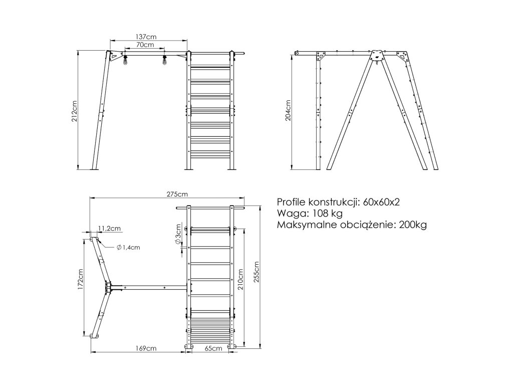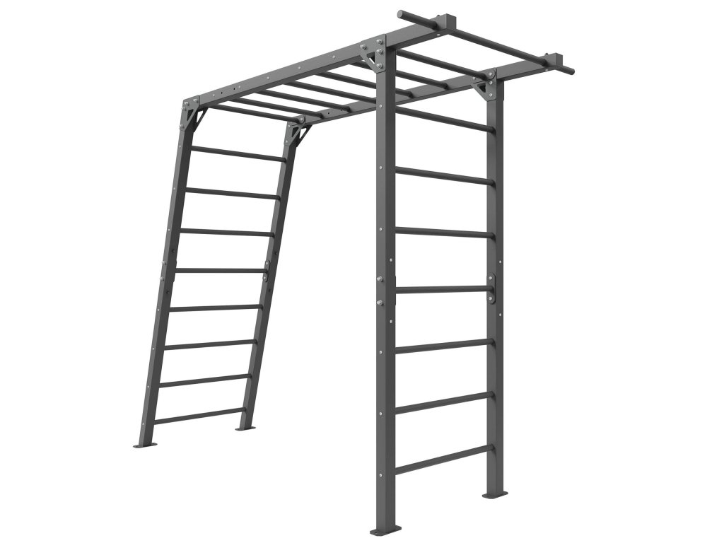 Žebřiny jsou ve svislé poloze a mají výšku 210 centimetrů a 8 příček. Příčky jsou od sebe ve vzdálenosti 26 cm a mají průměr 3 cm. V úrovni poslední příčky se nachází předsunutá hrazda s šířkou 121 cm. Tato strana konstrukce lze využít na širokou škálu cviků, lze na ni připevnit také tréninkové gumy a nebo závěsný posilovací systém. Z druhé strany konstrukce se nachází šikmý a horizontální žebřík, který najde ideální využití jako prolézačka pro děti.