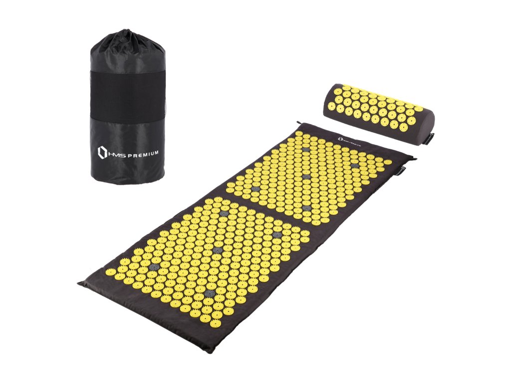 Zestaw do akupresury HMS Premium AKM04 składa się z maty do masażu, poduszki i torby ułatwiającej przechowywanie.