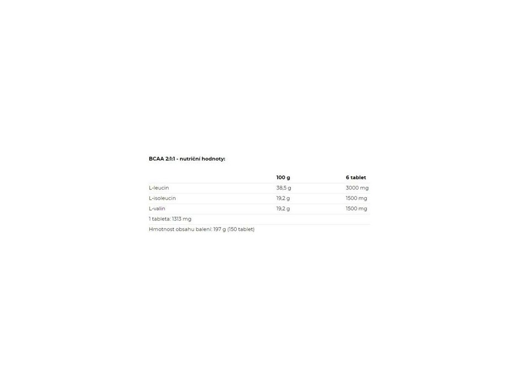 Niezbędne aminokwasy rozgałęzione w proporcji 2:1:1, w formie tabletek. Wystarczające spożycie wysokiej jakości białek o optymalnym spektrum aminokwasów przyczynia się do wzrostu mięśni. BCAA w proporcji 2:1:1 1000 mg BCAA w jednej tabletce Praktyczne dawkowanie w postaci BCAA 2:1:1 w tabletkach przeznaczone jest dla: intensywnie trenujących sportowców Skład: L-leucyna, L-izoleucyna, L-walina, wypełniacz: celuloza mikrokrystaliczna , substancja przeciwzbrylająca stearynian magnezu, substancja wypełniająca: guma celulozowa usieciowana, substancja zagęszczająca hydroksypropylometyloceluloza Zalecane dawkowanie produktu BCAA: 3 tabletki 60 minut przed wysiłkiem, 3 tabletki bezpośrednio po wysiłku. Nie przekraczać zalecanej dawki. Sposób użycia: zgodnie z zaleconym dawkowaniem należy połknąć tabletki i popić odpowiednią ilością wody. Napoje alkoholowe i mleczne nie są odpowiednie. Nie gryź tabletek! Po otwarciu przechowywać w temperaturze do 25°C i zużyć w ciągu 3 miesięcy. Składniki: L-leucyna, L-izoleucyna, L-walina, substancja wypełniająca celuloza mikrokrystaliczna, substancje przeciwzbrylające stearynian magnezu i dwutlenek krzemu. Uwaga: Suplement diety szczególnie odpowiedni dla sportowców. Nie zastępuje zróżnicowanej diety. Nie jest przeznaczony dla dzieci, kobiet w ciąży i karmiących piersią. Przechowywać w miejscu niedostępnym dla dzieci! Przechowywać w suchym miejscu w temperaturze do 25°C, z dala od bezpośredniego światła słonecznego. Chronić przed mrozem. Producent nie ponosi odpowiedzialności za szkody spowodowane niewłaściwym użytkowaniem lub przechowywaniem. Dostawca: NUTREND DS, as, Chválkovice 604, 779 00 Ołomuniec, Republika CzeskaParametry dodatkowe