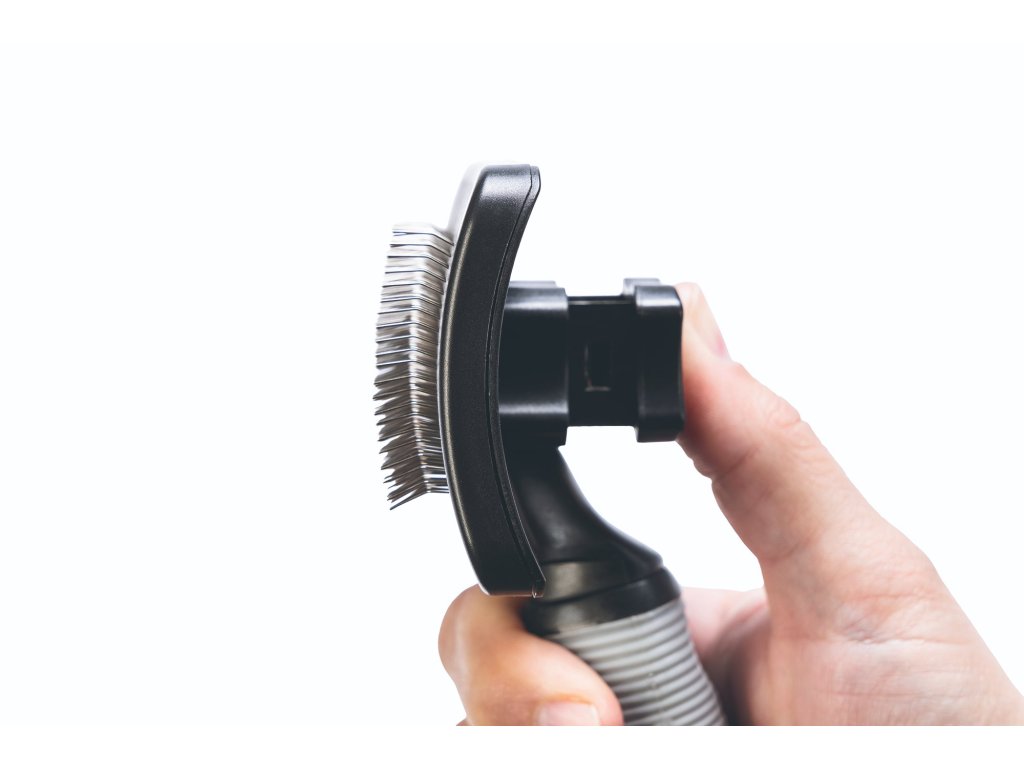 Późniejsze usuwanie sierści i brudu ze szczotki jest niezwykle proste! Po naciśnięciu przycisku na szczotce system „zeskrobuje” włosy i brud. Z łatwością usuniesz je z pędzla.