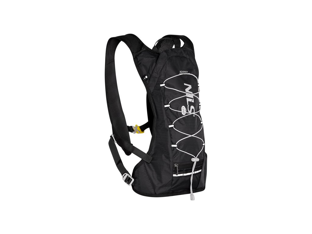 Główna komora plecaka wyposażona jest w przegrodę, w górnej części znajdują się 2 rzepy umożliwiające zawieszenie hydrobagu (nie wchodzą w skład zestawu). Tył głównej komory wykończony jest folią aluminiową, która pełni rolę izolacji pomiędzy hydrobagiem a tyłem, dzięki czemu napój nie będzie podgrzewany przez ciepło z tyłu. Wąż hydrobagu można poprowadzić przez przelotki po prawej i lewej stronie pod panelami barkowymi. Przód plecaka wyposażony jest w gumową linkę z hamulcem, pod którą można przechowywać np. matę. Poniżej znajdziemy kieszeń, w której ukryta jest siatka, którą można wyciągnąć i przypiąć do boków plecaka za pomocą osprzętu z karabińczykami. Po prawej stronie znajduje się kolejna kieszeń zapinana na zamek, która idealnie nadaje się na telefon, portfel czy np. klucze. Na górze plecaka znajduje się pasek ułatwiający noszenie plecaka w dłoni. Plecy i ramiączka wykonane są z siateczki, uzupełnionej oddychającą pianką, co zwiększa oddychalność panelu, dzięki czemu plecy będą mniej się pocić. Szelki wyposażone są w odblaskowe paski umożliwiające wyciągnięcie węża z hydrobagu oraz siateczkowe kieszenie. Na lewym pasku znajduje się również kieszeń z przezroczystym przodem, w której można przechowywać np. kartę w razie zgubienia, numer startowy itp. Paski naramienne są połączone pasem piersiowym, którego wysokość można regulować. Pasek połączony jest z gwizdkiem za pomocą plastikowej klamry.