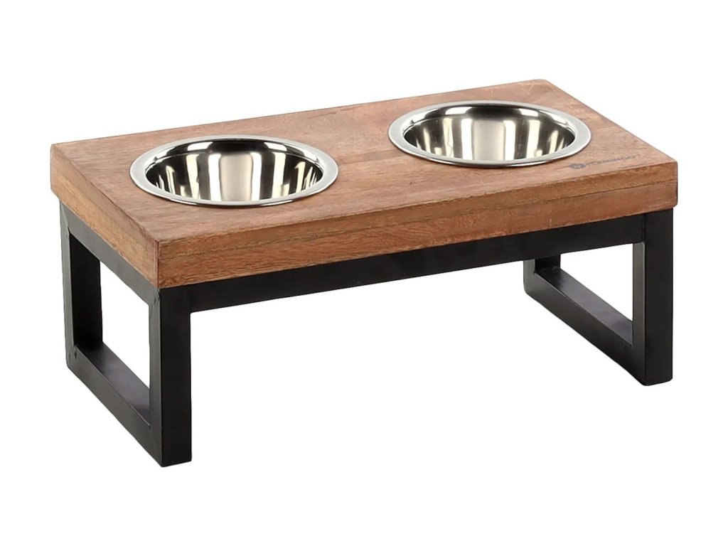 Stabilna metalowa konstrukcja z czarną powierzchnią i ochroną przed zarysowaniami podłogi. Blat z drewna mango z 2 wyjmowanymi miskami. Misy ze stali nierdzewnej można myć w zmywarce. Dla kotów i psów każdej wielkości i rasy. Przeznaczony do użytku w pomieszczeniach zamkniętych.