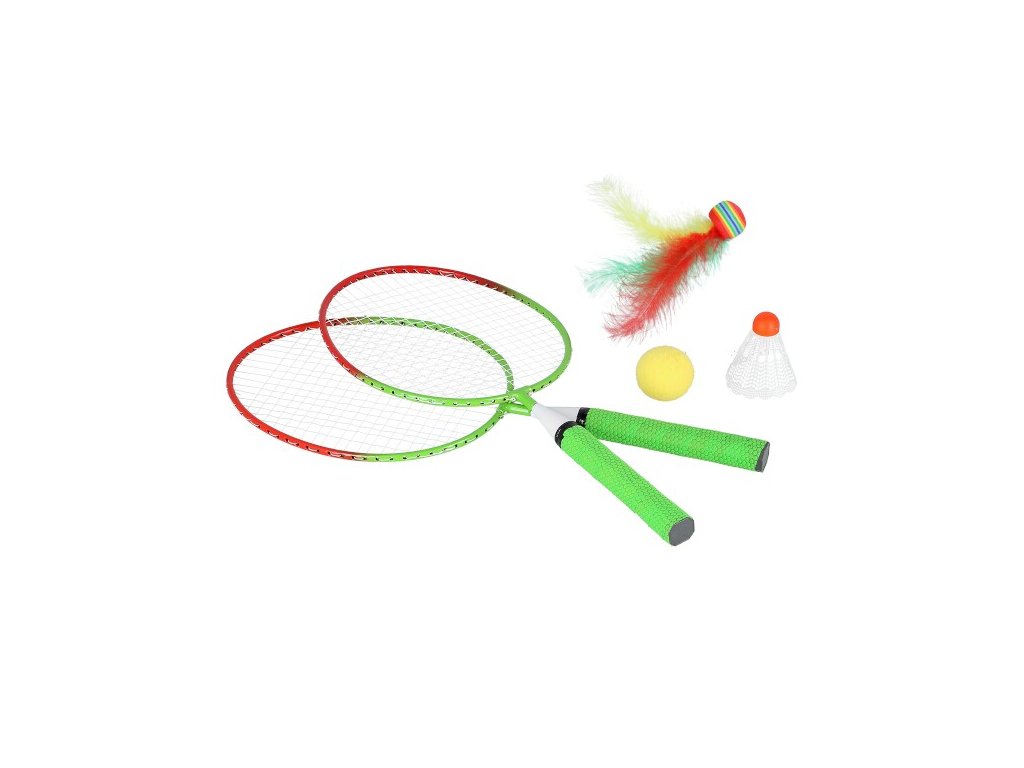 Minizestaw do badmintona NILS NRZ051. Zestaw zawiera 2 krótkie rakiety, 1x lotkę, 1x piłeczkę piankową i 1 piłeczkę z piór.