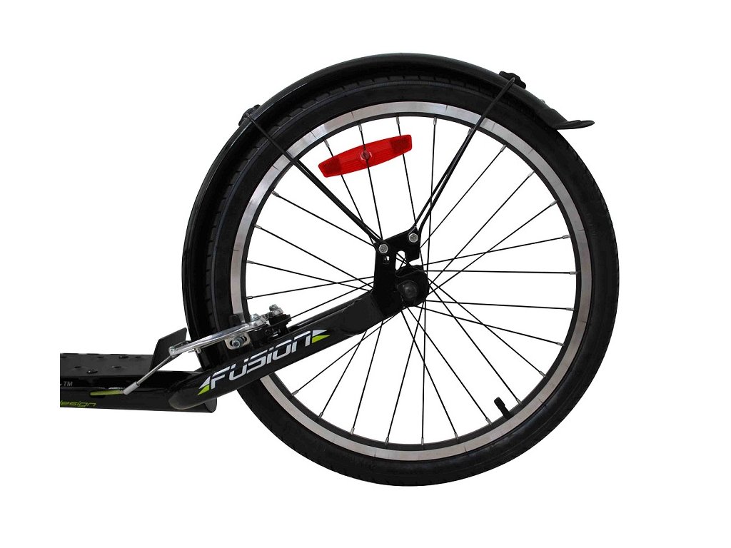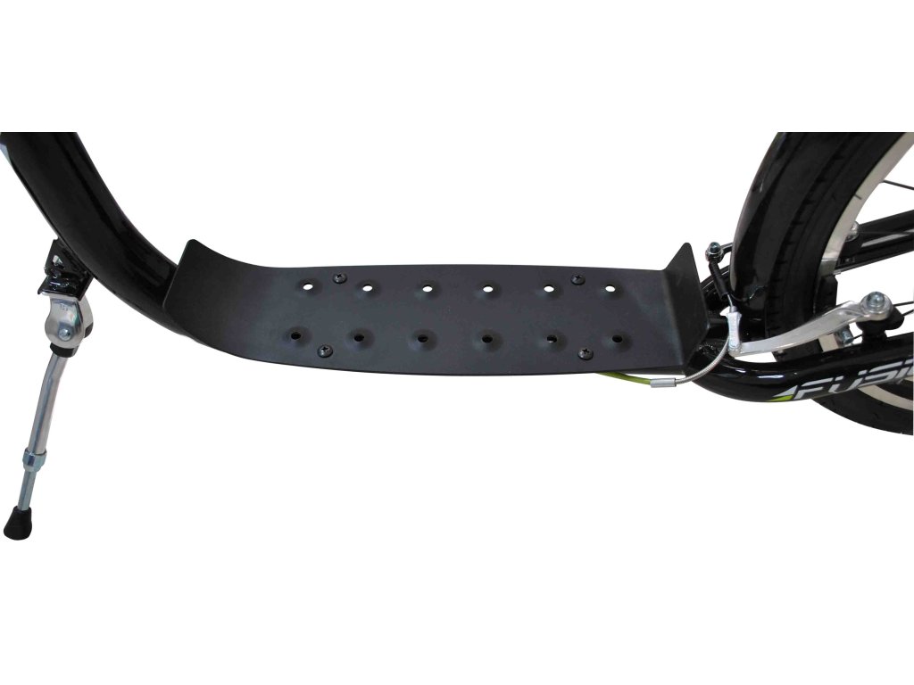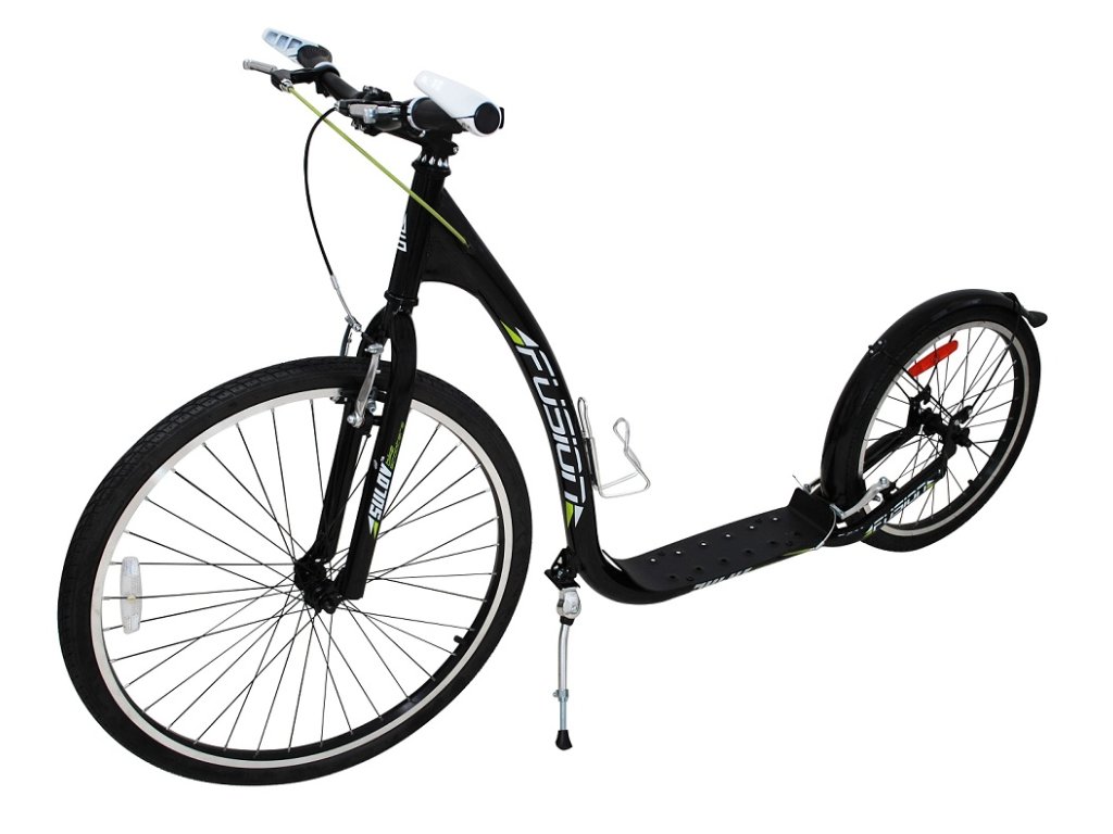 Dzięki dużym pompowanym kołom 26"/20" hulajnoga sportowa FUSHION idealnie nadaje się do jazdy po mieście i po utwardzonych ścieżkach rowerowych. - Rama hulajnogi wykonana jest z wysokiej jakości lekkiej stali - W szprychach kół znajdują się odblaski dla zwiększenia bezpieczeństwa - Przednie i tylne aluminiowe hamulce typu V-brake - Aluminiowe felgi - Na wyposażeniu znajduje się uchwyt na bidon, składana podstawka, tył stalowe narożniki błotników i kierownicy - Maksymalne obciążenie 120 kg Parametry techniczne: - Opony: przód 26" x 1,75" i tył 20" x 1,75" - Szerokość kierownicy: 59 cm - Wysokość kierownicy 96 cm (bez regulacji) - Długość całkowita: 170 cm - Rozmiar podnóżka: długość 40 cm, szerokość w najszerszym miejscu 12 cm - Wysokość od podłoża do stopnia: 15 cm - Waga: 12,9 kgParametry dodatkowe