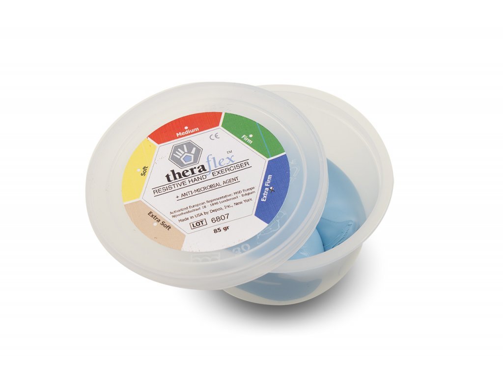 Theraflex Putty™ Mieszanka do ćwiczeń, rehabilitacji i wzmacniania™ wzmacnia osłabiony chwyt podczas ćwiczeń i jest używana do ćwiczeń rehabilitacyjnych lub łagodzenia stresu. Doskonały pomocnik w relaksacji i rehabilitacji zmęczonych palców podczas długotrwałej pracy na klawiaturze. Theraflex Putty jest bezwonny, nie plami i nie pozostawia śladów na dłoniach, jest nietoksyczny, nietłusty, hipoalergiczny i nie zawiera lateksu. Materiał jest wzbogacony składnikiem antybakteryjnym. Konserwacja: myć letnią wodą z mydłem.